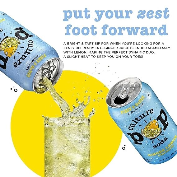 Description Enjoy a refreshing twist on soda with Culture Pop Ginger Lemon & Turmeric Probiotic Soda ! This fizzy, flavorful beverage blends bold ginger and zesty lemon with a hint of earthy turmeric. Packed with live probiotics for gut health, it’s a great-tasting, low-sugar alternative to traditional sodas. Made with clean, non-GMO ingredients, Culture Pop is gluten-free, kosher, and contains no stevia or artificial sweeteners. Perfect for those who want a functional, delicious drink without the junk. Features Flavor : Ginger, Lemon & Turmeric Probiotic : Contains live probiotics for gut health Low Sugar : Only 5g sugar per can – no stevia or artificial sweeteners Clean Ingredients : Non-GMO, kosher, and gluten-free Sparkling Juice Alternative : A flavorful, fizzy drink without the guilt 12-Pack : Includes twelve 12 fl oz (355ml) cans Shelf-Stable : No refrigeration required until opened