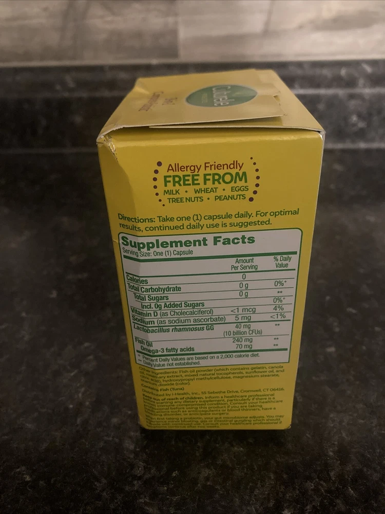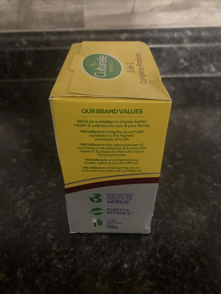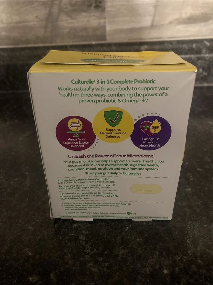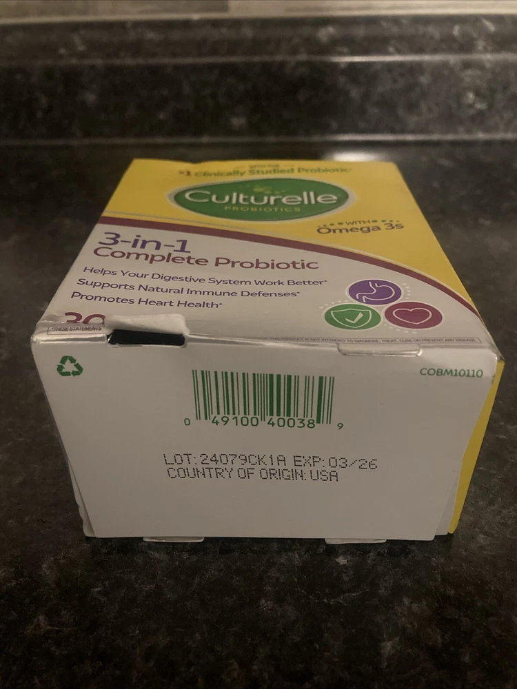 Culturelle 3-in-1 Complete Probiotic with Omega 3s - 30 Caps Exp. 03/2026. New and sealed box Box does have some damage too it Please see photos Exp 03/2026