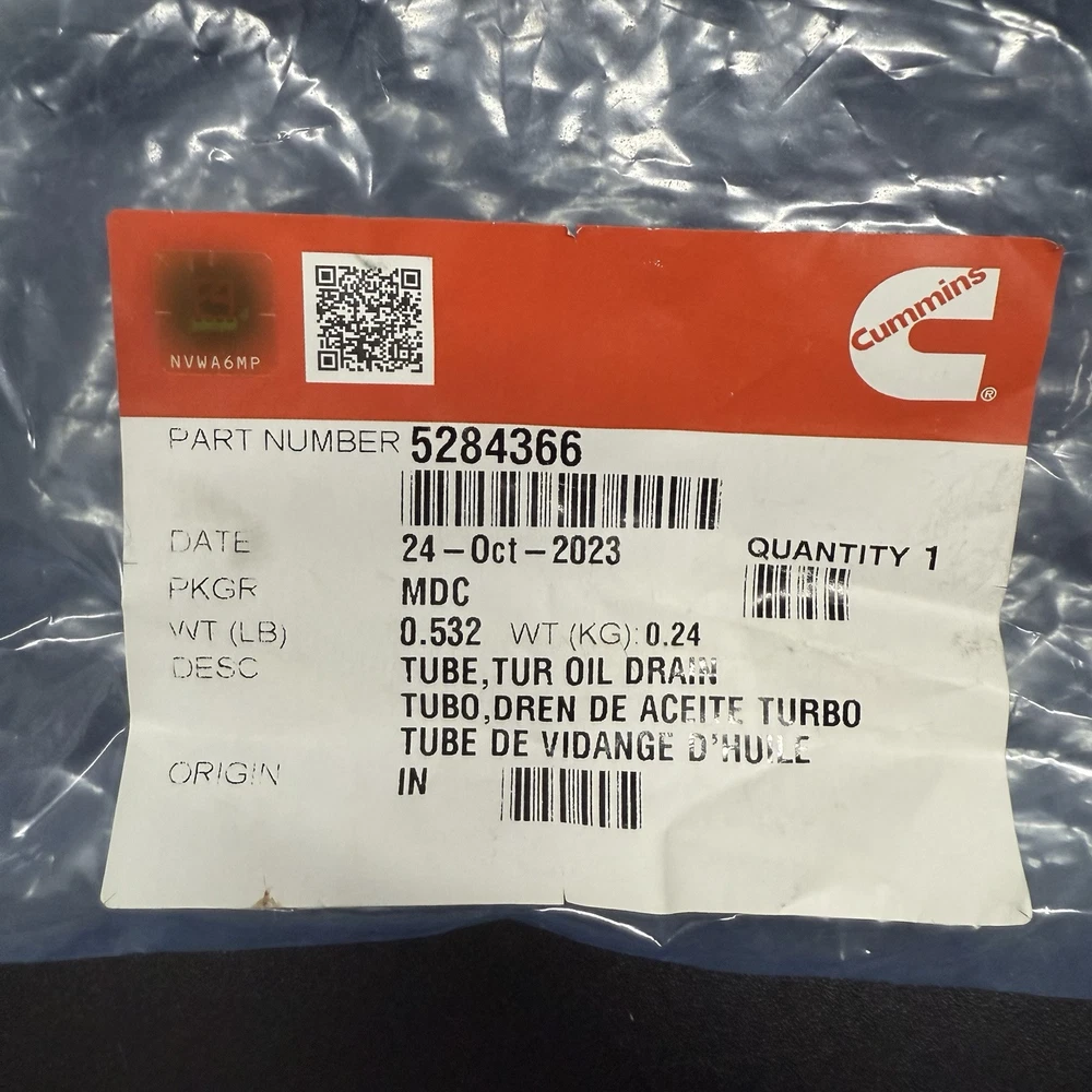 Cummins 5284366 Turbocharger Oil Drain tube OEM