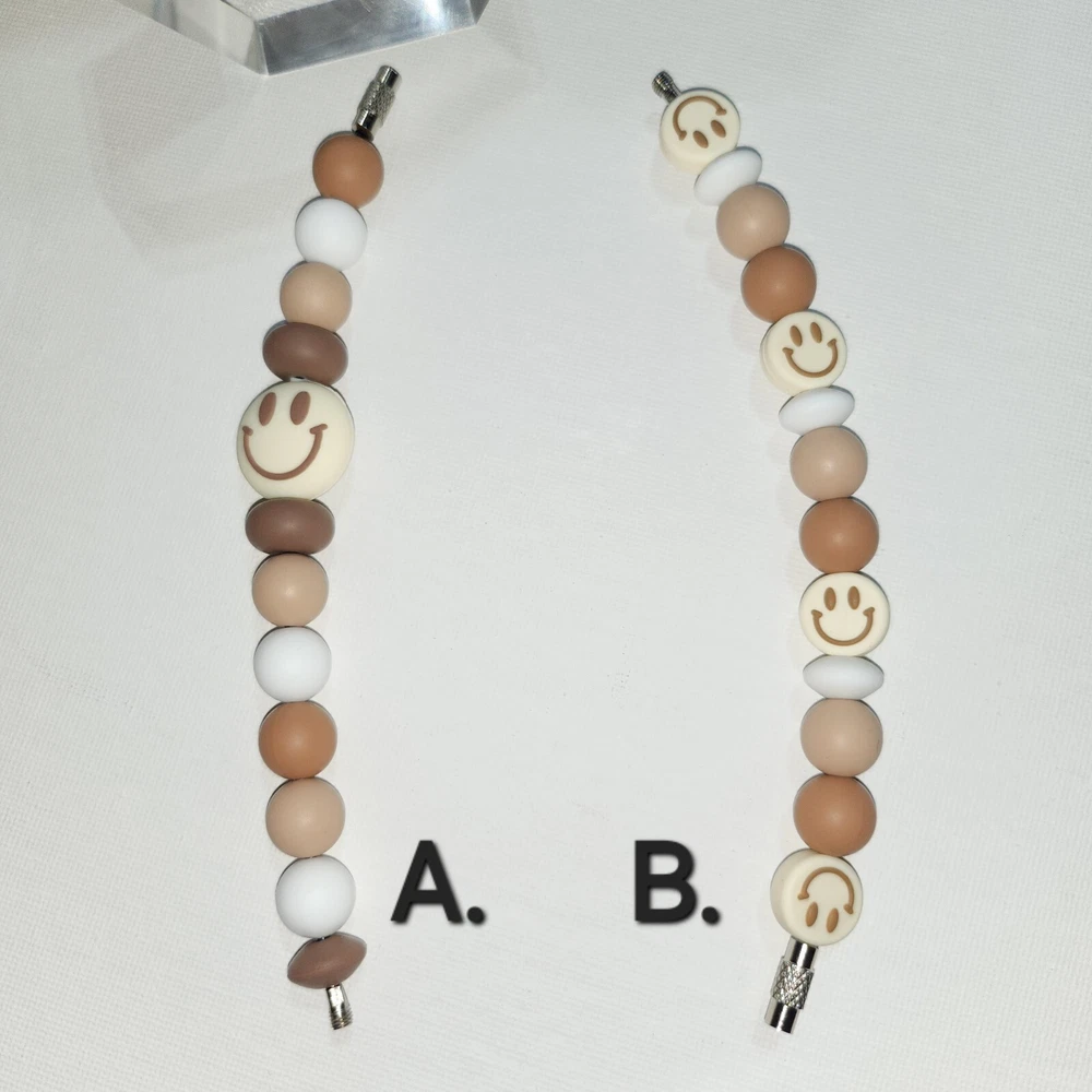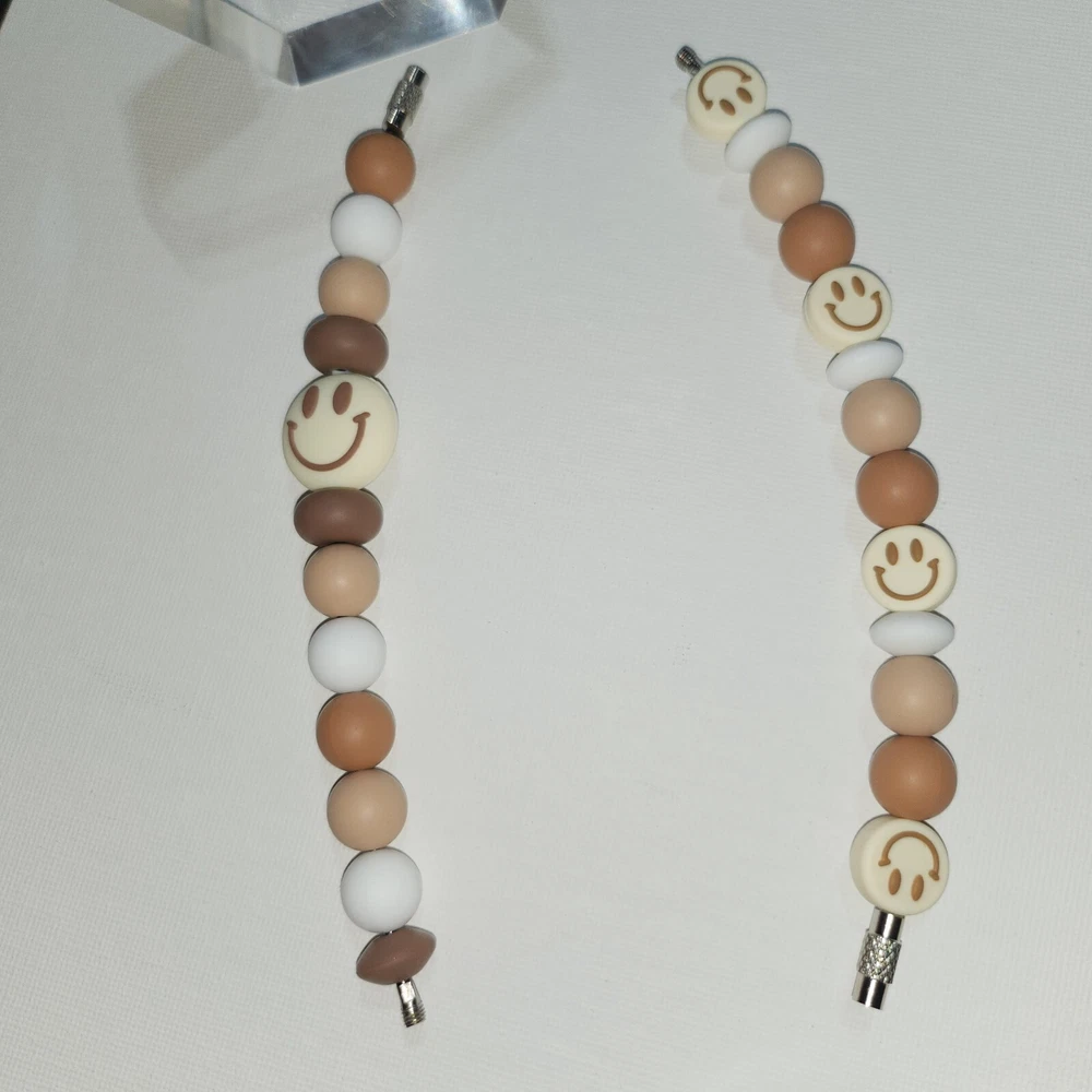 This handmade cup charm is a perfect accessory for your tumbler handle. The round spacer beads come in a lovely combination of brown and white, with a cute smiley face π design. The charm is made of high-quality silicone material with a matte finish for durability. The charm is a great addition to your collection of cup accessories and can be used as a decorative piece or a marker for your drink. It is suitable for all types of tumblers and cups. Add some personality to your cup with this adorable cup charm! If you prefer to purchase just one, message me & I'll update. $8.50 Each If you have any questions regarding this item, please feel free to message me. Beads can be washed as needed in warm soapy water. All the beads I used came from ABC Bead Supply. Product made May 2024