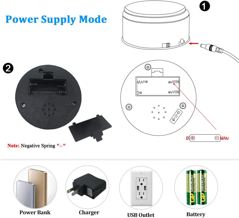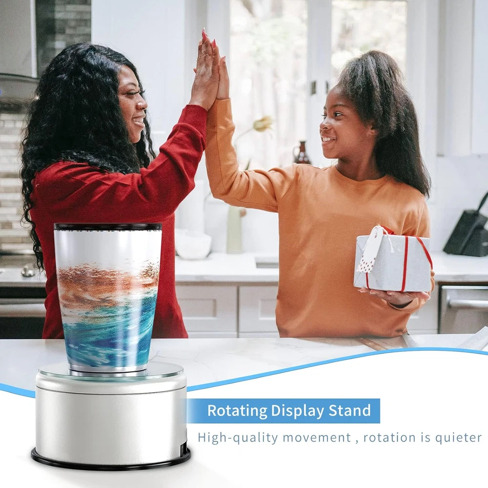 Professional Tumbler Display Turntable - 360Β° revolution designed motorized tumbler turner machine, perfect for displaying bling bling epoxy glitter tumbler cups in all directions and angles. Much more alluring and attractive to draw people's eyes. A Must Have for Tumblers! - 2 different modes to choose rotation speed as your wish. Convenient and easy operation to turn off/on tumbler spinner stand through black switch. Mirrored top provide the perfect reflection effects to accent your tumbler cups. Sturdy & Strong Capacity - Rotating cup display turntable rotate much more stably, can easily hold 9, 10, 12, 16, 20, 22, 24, 30, 32, 40 oz tumbler cups of various different types, brands and sizes. Display cup turner for tumbler cups especially used in the home living room, souvenirs store, library, opening ceremony, anniversary celebration, supermarkets and exhibitions for advertising purposes. Battery & USB Operated - Silver tumbler turner machine is not only 3 * AAA batteries (not included) driven, but USB operated. Bonus USB AC adapter is included for standard outlet. Lower power consumption for durable use. Widely Used in Various Scenarios - Rotating display stand is environmental friendly, you can use it to display your cups in a window, shelf storage ,on a counter, tiered display shelf, or the floor. Suitable to family, office, retail stores, multiple shop, window display, solid display, superstore, exhibitions and for other advertising purposes Packing or home notion. Product Description 360 Degree Rotating Cup Display Stand Turner For Tumblers Specification: Item Name: Electrical Rotating Display Turner Rotation direction: Clockwise 360 Degree Power Supply: 3 * AAA batteries (not included) or USB operated Great auto-rotating display turner to showcase your tumblers glitter cups without holding & turning them with hands. You can take beautiful videos to display custom tumblers that you make. Welcome to share your DIY art videos with us. Can easily hold 9, 10, 12, 16, 20, 22, 24, 30, 32, 40 oz tumbler cups of various different types, brands and sizes. 360 Degree Rotating Display Base Premium Quality & Elegant Mirror Base Optional Various Charging Methods Comes with USB Cable and Adapter