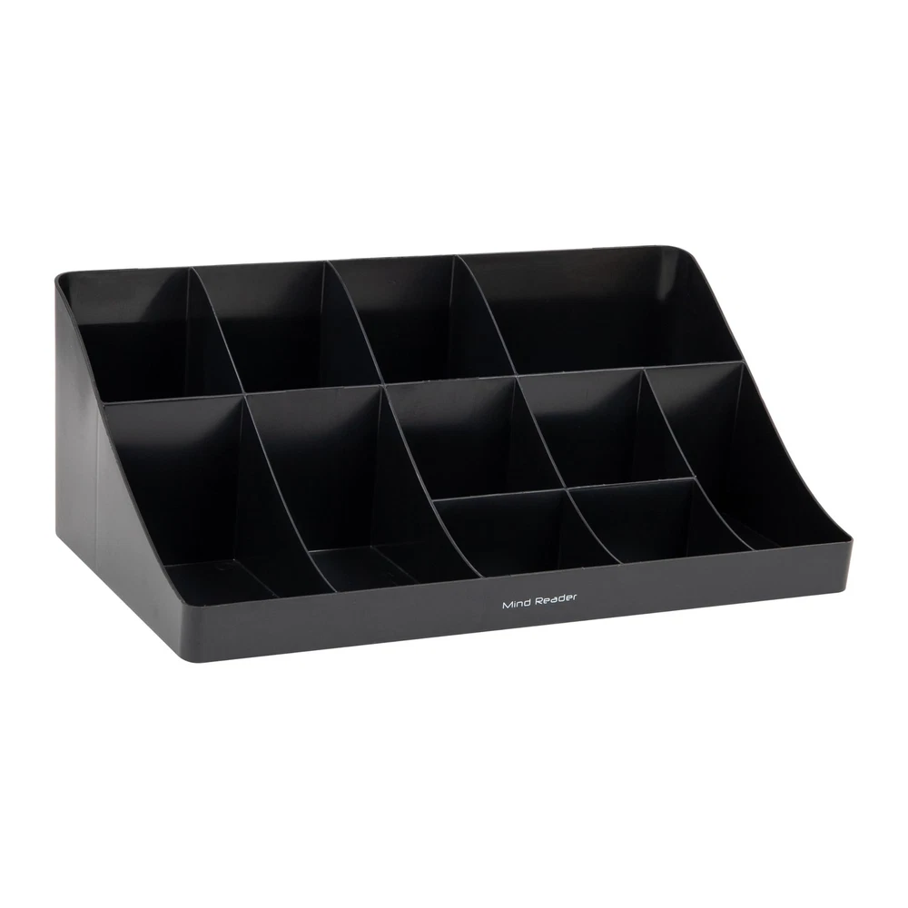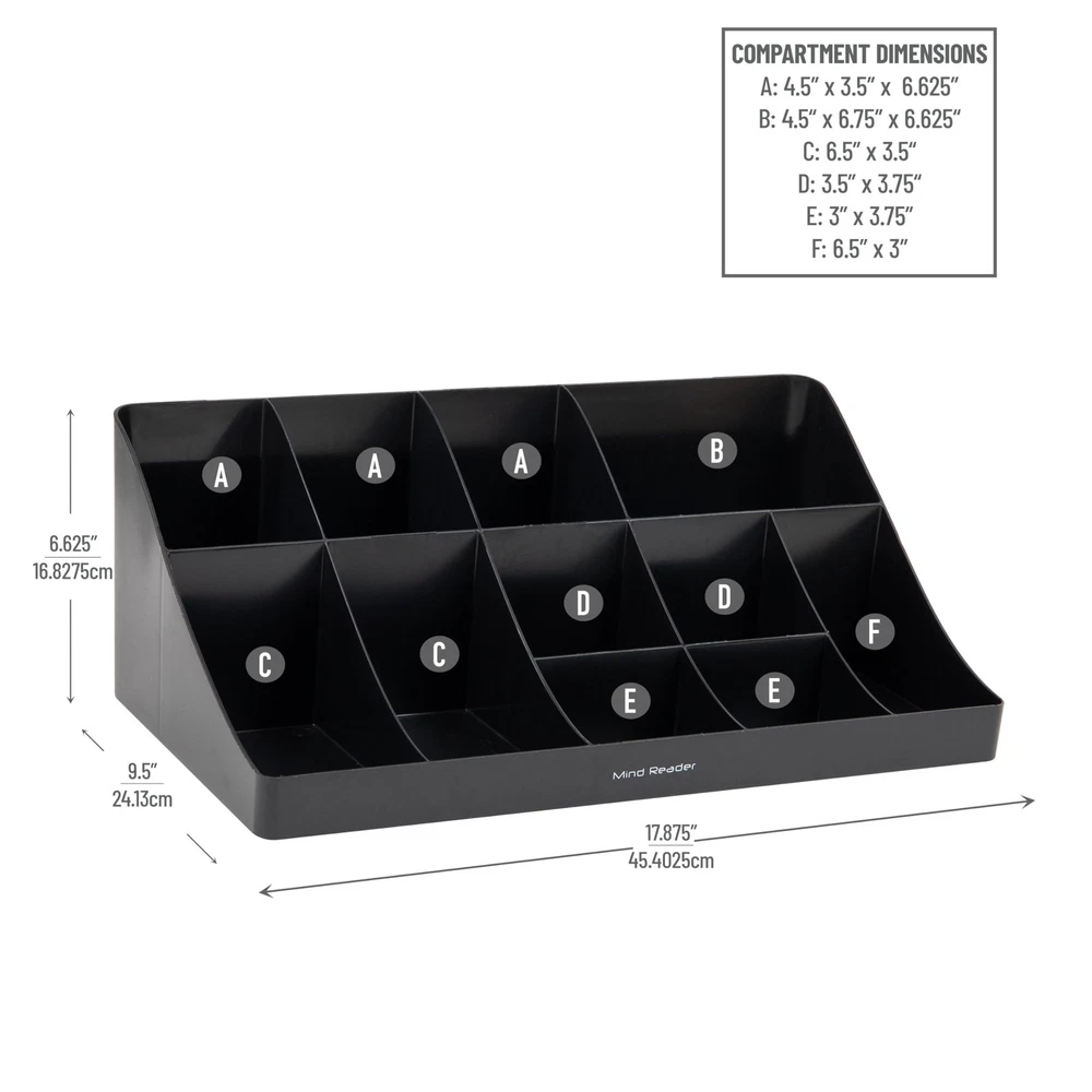 This piece Black coffee condiment organizer is made from a tough and safe plastic that will stand the test of time. This unit has 11 compartments that is a necessity for any Breakroom or Lunchroom. No assembly required. Efficient Organization: The 11-compartment cup and condiment organizer displays items in a neat and convenient layout, allowing you to quickly and easily grab your beverage and condiments on the go, making it perfect for busy individuals Versatile Usage: This storage caddy is versatile and can be used on countertops or inside cabinets for easy access and storage. It is ideal for use at home, office, waiting rooms, front office lobby, hospitality suites, and more Durable and Low-Maintenance: Made with durable materials, this 2-tier coffee and condiment organizer is built to withstand daily use and is easy to maintain. Simply clean it with mild soap and a damp cloth to keep it looking new for years to come Stable and Secure: Rubber grips on the bottom of the countertop organizer keep it securely in place Perfect Size: Measuring 17.875 inches long x 9.5 inches wide x 6.625 inches tall (45.40 x 24.13 x 16.83 centimeters) and weighing 1.88 lbs (.85 kilograms), this cup and snack organizer is the perfect size for any countertop