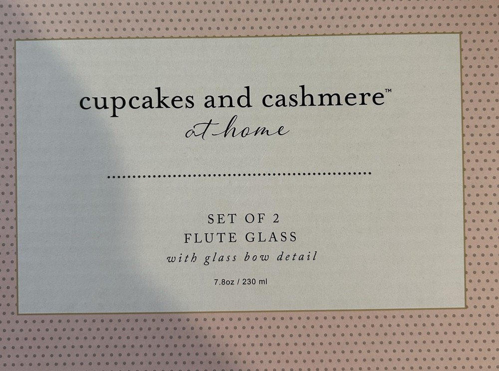Type: Champagne Flute Personalize: No Glassware Type: Champagne Glass Occasion: All Occasions Set Includes: Champagne Flute Material: Glass Department: Adults Color: Black Brand: Cupcakes and Cashmere Care Instructions: Hand Wash Only Country/Region of Manufacture: China Theme: Bow, Food & Drink, Cupcakes