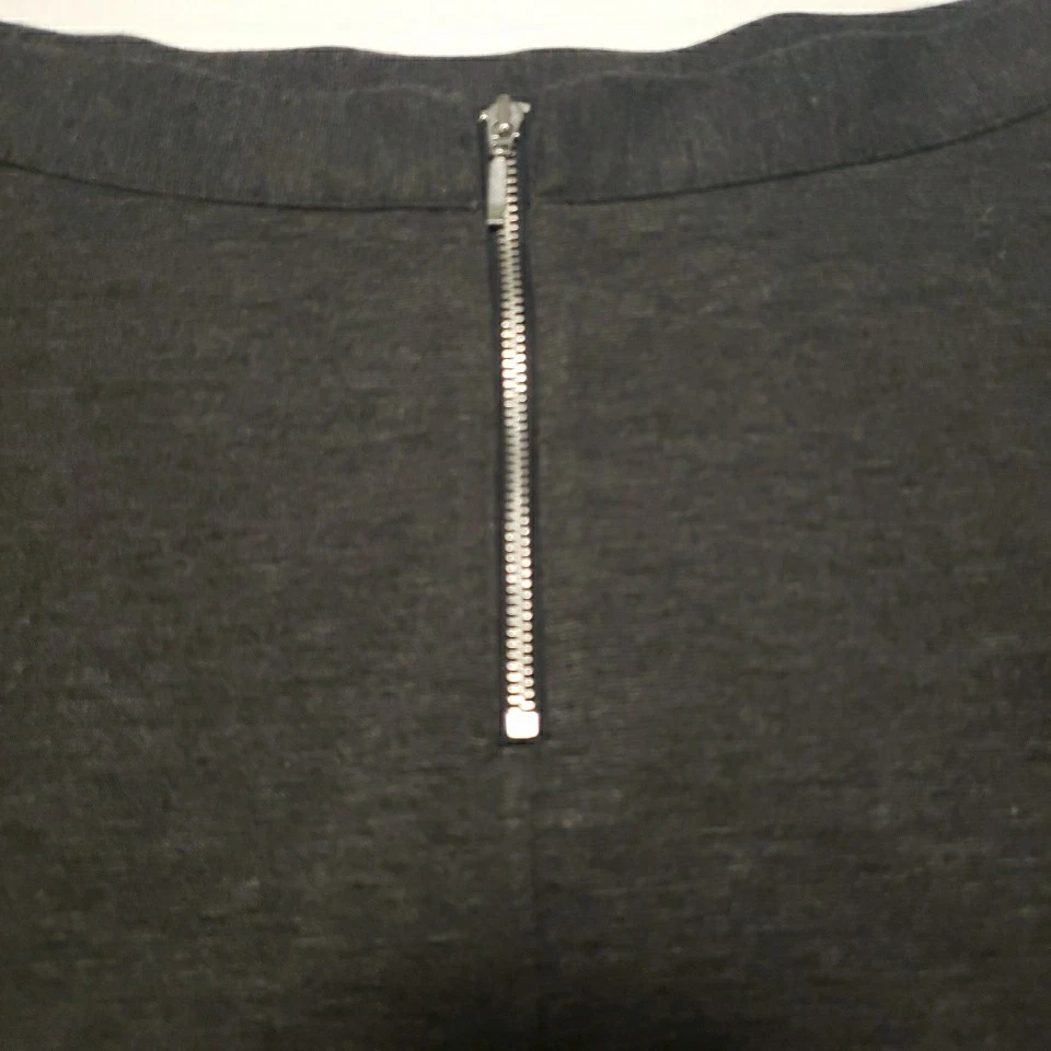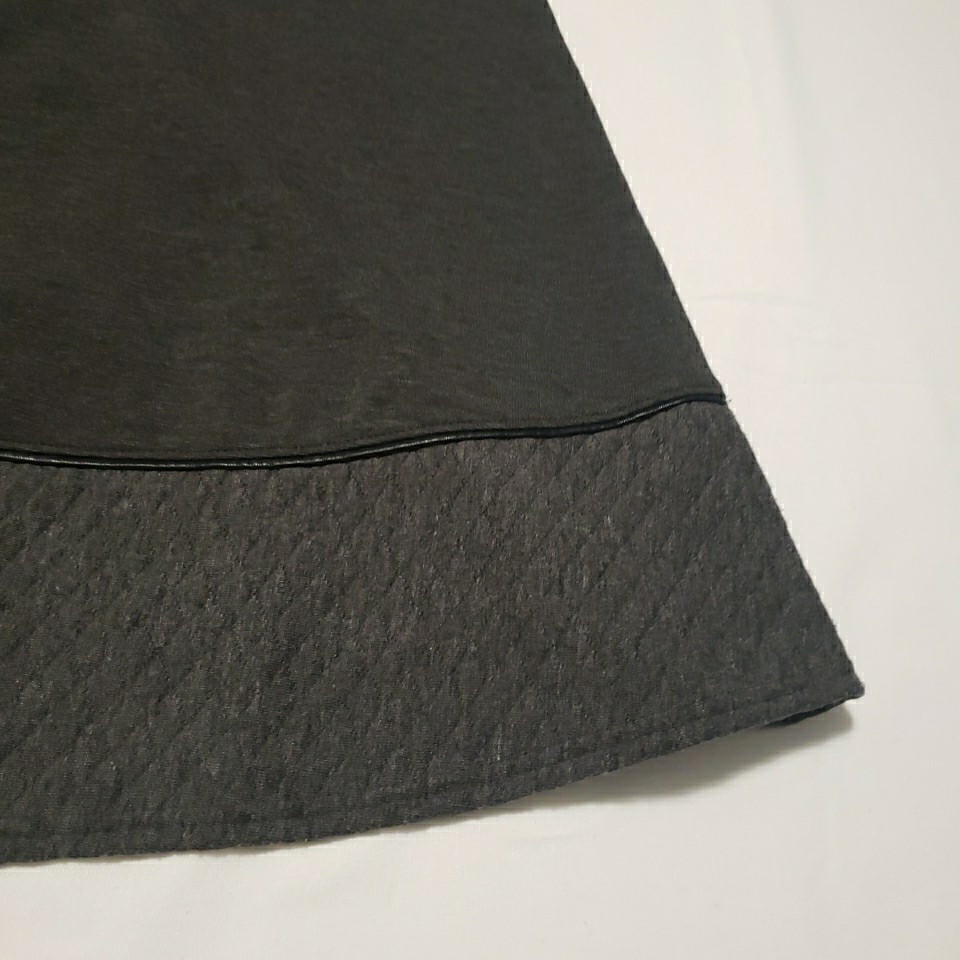 This is a Cupio women's gray skirt in size S, featuring a faux leather strip pattern on a quilted knit fabric in an A-line style. It has a zip closure and is machine washable. The skirt is knee-length, has a high rise, and is lightweight, making it suitable for various occasions like travel, weddings, parties, or casual wear. Perfect for all seasons, this skirt offers a stylish and versatile addition to any wardrobe.