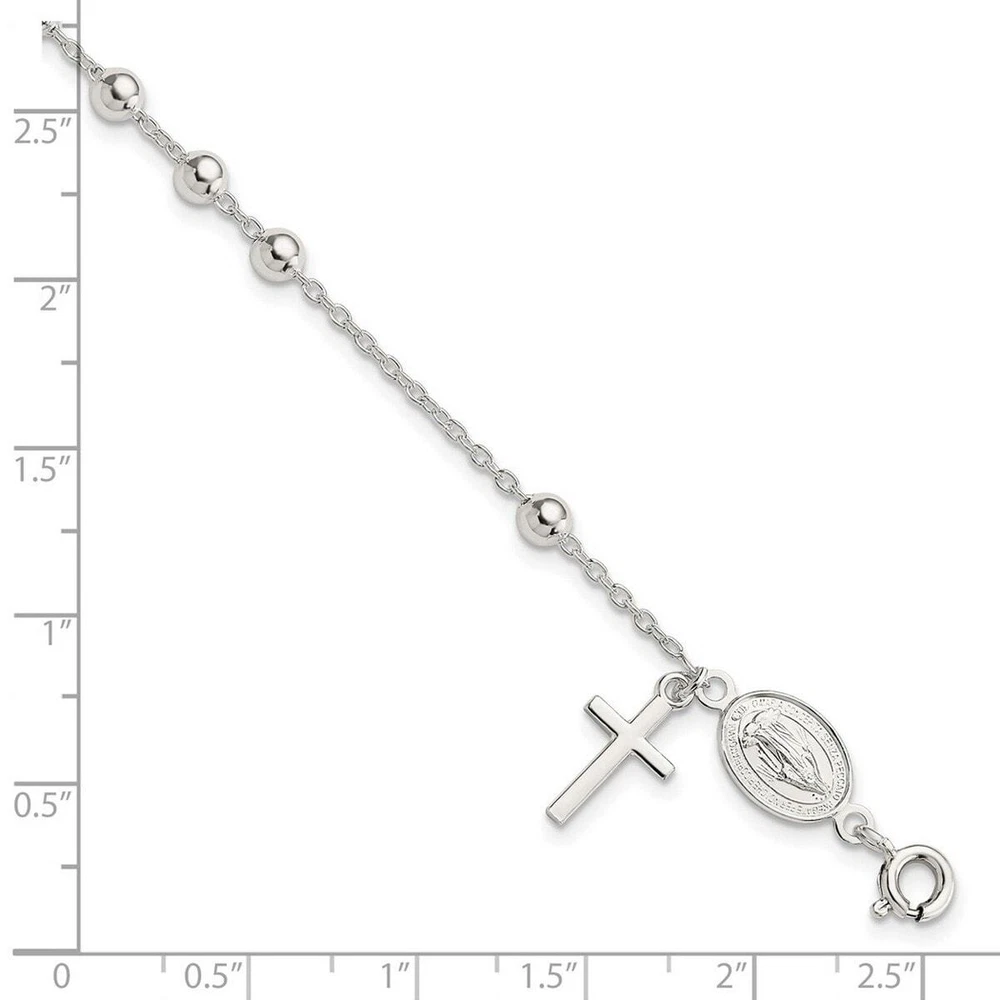 4mm Sterling Silver Polished Rosary Bracelet - 7.5 Inch - 4.0 Grams in Sterling Silver - Charm/Element Width: 8.4 mm - Width of Item: 4 mm - Charm/Element Length: 17.6 mm - Length of Item: 7.5 in - Chain Length: 7.5 in - Chain Width: 1.58 mm - Clasp /Connector: Spring Ring - Finish: Polished - Chain Type: Cable - Feature: Semi-Solid - Clasp Width (Male end): 5.69 mm - Clasp Width (Female end): 2.7 mm - All of our jewelry for women and men are authenticated with a 10K or 14K hallmark and are tested to pass FTC regulations. Free Shipping Over $49.99* Details Curata 925 Sterling Silver 7.5" Polished Rosary Dangle Cross Bracelet Product Description: 4mm Sterling Silver Polished Rosary Bracelet - 7.5 Inch - 4.0 Grams in Sterling Silver - Charm/Element Width8.4 mm - Width of Item4 mm - Charm/Element Length17.6 mm - Length of Item7.5 in - Chain Length7.5 in - Chain Width1.58 mm - Clasp /ConnectorSpring Ring - FinishPolished - Chain TypeCable - FeatureSemi-Solid - Clasp Width (Male end)5.69 mm - Clasp Width (Female end)2.7 mm - All of our jewelry for women and men are authenticated with a 10K or 14K hallmark and are tested to pass FTC regulations.