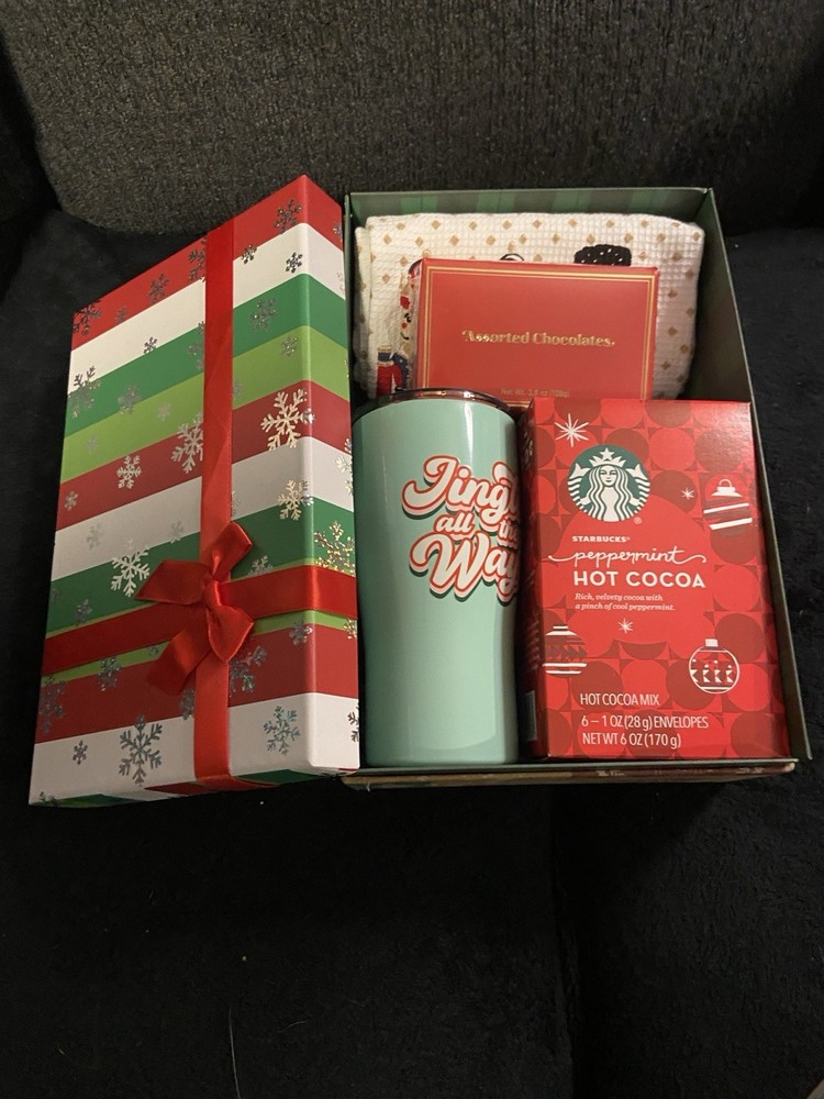This curated holiday gift box features a medium-sized cardboard container filled with festive items perfect for Christmas. The geometric brown box includes,Christmas cocoa, a metal travel mug, chocolate, and a Nutcracker hand towel, this gift box is sure to delight any recipient on your gift list. Made in the United States, this gift box is a cozy and thoughtful present for the holiday season.