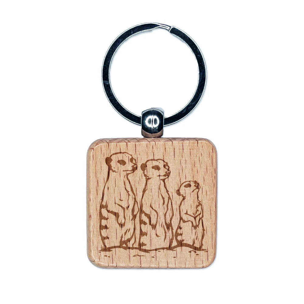 Curioso Familia Meerkat Grabado Madera Cuadrado Dije Etiqueta