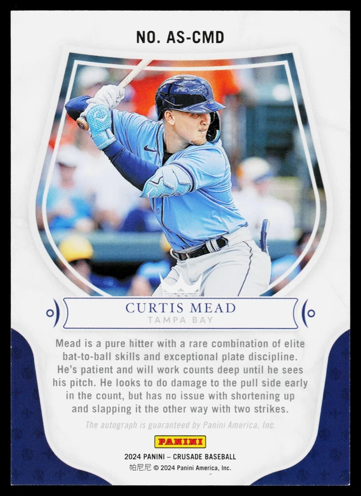 You will receive a Near Mint or Better, Curtis Mead, 2024 Panini Crusades, Apprentice Signatures, Tampa Bay Rays card PLEASE NOTE: SOME CARDS THAT GO THROUGH OUR SCANNER MAY APPEAR TO HAVE LINES THROUGH THEM. THEY ARE NOT ACTUAL SCRATCHES, SIMPLY FALSE IMAGE LINES. WE WILL NOT INTENTIALLY SELL, DAMAGED CARDS. NEW CARDS LISTED DAILY ORDERS SHIP NEXT DA Y (Weekends as mail service is available) VISIT OUR STORE FOR MORE DEALS! USE THE SEARCH ICON IN THE STORE TO FIND YOUR FAVORITE TEAMS & PLAYERS! Be sure to save us as sellers to be the first to be notified when new and exciting cards are posted! Please note, we are not professional graders, and the condition of the card you purchased is highly subjective. Please refer to the high quality scans of the card you are viewing, and determine the condition of the card for yourself. Feel free to reach out with questions! All cards are in EX-NM+ condition, unless stated otherwise Chrome cards from various brands might have minor light surface scratches, which is typical with these type of cards. Any major, deep scratches or major surface issues will be noted, if present. We take pride in the condition of all of our cards, including commons. Our promise to you, is that we will not sell a card we would not buy ourselves. Of course things slip by, however customer service is our #1 Priority, and we are always here for a message for ANY, and ALL issues. Thank you very much for stopping by, feel free to reach out! - Titan (Son) & Andy (Dad)