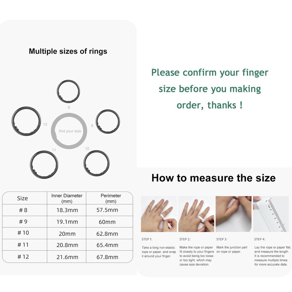 Stainless Steel Frame Curved Design Smart Ring Fitness Tracker Activity Sport Record Sleep Quality Heart Rate SpO2 Skin Temperature Monitoring with Charging Case 【Long Battery Life + Charging Case】Our smart ring comes with 7days long battery life, and it comes with a Charging Box which can charge the ring with 12times. If your charging box and ring both full charged, then you don't need more charging for about 30days, and this will ensure you to handle your body situation always for business traveler or outdoor enthusiast. 【IP68 Waterproof】The smart ring health tracker features IP68 waterproof rating, withstanding depths of up to 50 meters. Whether you're washing your hands, showering, swimming, or hiking in the rain, you don't need to remove the ring, allowing you to monitor your health data anytime, anywhere. 【Health Monitoring】The smart ring is equipped with a high-precision and high-performance heart rate sensor, which can monitor your heart rate, sleep quality, skin temperature etc., 【Multi-Exercise Modes and Fitness Tracker】The Smart Health Ring tracks your activities throughout the day with high precision. For example, the Fitness Ring tracks your steps, distance walked and calories burned. In addition, the Smart Ring features different exercise modes such as walking, running and cycling. The ring tracks and scores your activities to encourage a more active lifestyle! 【Confirm Size Before Purchase】Please refer to the size chart in the images to select the appropriate size for you. Note that the Smart Ring is intended for everyday health monitoring and is NOT a substitute for professional medical devices. 【Gesture Control Features】Once you've enabled AssistiveTouch, you can operate apps like TikTok, control music, or take photos with simple finger gestures—just shake your finger. No need to touch your phone! 【Women’s Health Tracking】Stay informed with menstrual and ovulation reminders, using body temperature and cycle data to provide accurate and timely predictions for women’s health management.