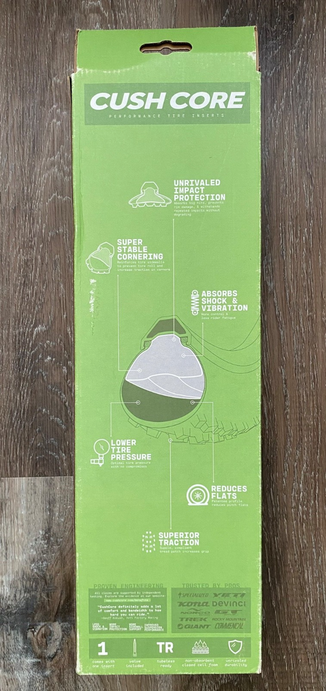 CUSH CORE ~ NEW ~ XC Single Performance Tire Insert ~ 27.5 Inch ~ NEW IN BOX *Brand: Cush Core *Tire Insert *Size: 27.5 inches *Comes with 1 tire insert & 1 valve *Absorbs shocks & vibrations *More impact protection *More Sidewall support *Improved suspension performance *Tubeless ready *Durable *Non-absorbent foam *Condition: NEW (Open Box) and in its original retail packaging. *We have a smoke free home