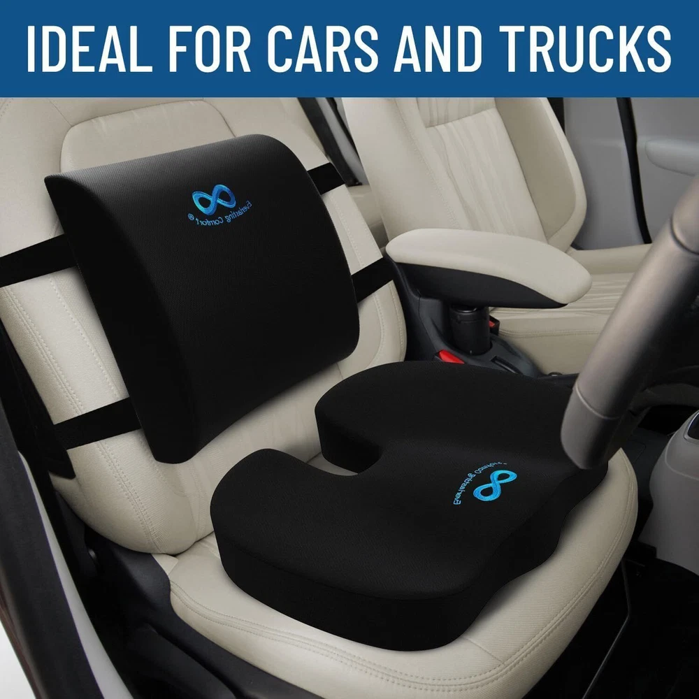 Special Feature Contoured Shape, Breathable Material, Lumbar Support, Ergonomic Design, High-Density Memory Foam Color C. Black (Seat/Back) Size Standard Cushion Sets Fill Material Memory Foam About this item All-Day Driving Comfort: Enjoy lasting support on long drives with our premium memory foam car seat cushion. It adapts to your body’s shape without flattening, providing consistent comfort on every journey Enhanced Posture: Our lumbar support cushion for car seats features a U-shaped coccyx cutout that encourages proper spinal alignment and promotes better posture while driving Ultimate Driving Comfort: Upgrade your car seat with our premium bundle, featuring ergonomically designed back and seat cushions that deliver superior support for comfortable driving, no matter how long the journey Instant Pain Relief for Drivers: This car seat cushion features an ergonomic design that promotes proper posture, relieves pressure, and provides essential lumbar support, ensuring a comfortable driving experience Dual Adjustable Straps: With the included strap extension, the lumbar pillow can fit car seats up to 32" (81cm) wide and can be easily removed for a secure fit every time Special Feature Contoured Shape, Breathable Material, Lumbar Support, Ergonomic Design, High-Density Memory Foam Color C. Black (Seat/Back) Size Standard Cushion Sets Fill Material Memory Foam Shape Rectangular Age Range (Description) All Life Stages Recommended Uses For Product Sitting, Traveling, Resting, Recovery Use for Shoulder, Back, Neck, Body, Leg Material Memory Foam Item Firmness Description Medium Product Care Instructions Remove cover from memory foam. Cover is machine washable on a gentle cycle with cold water. Dryer safe (low heat) or air-dry setting. DO NOT PUT MEMORY FOAM IN WASHER OR DRYER. Number of Pieces 2 Pattern Solid Material Feature Breathable Variety Lumbar Pillow,Lumbar Support,Seat Cushion Material Type Free Latex Free Fabric Type Polyester Model Name Lumbar Support for Car Specific Uses For Product Posture Support, Lumbar Support, Added Comfort, Office Chair Support, Car Seat Support UPC 810062782178 Product Dimensions 17.5"L x 15.5"W Unit Count 1.0 Count Item Weight 3.41 pounds
