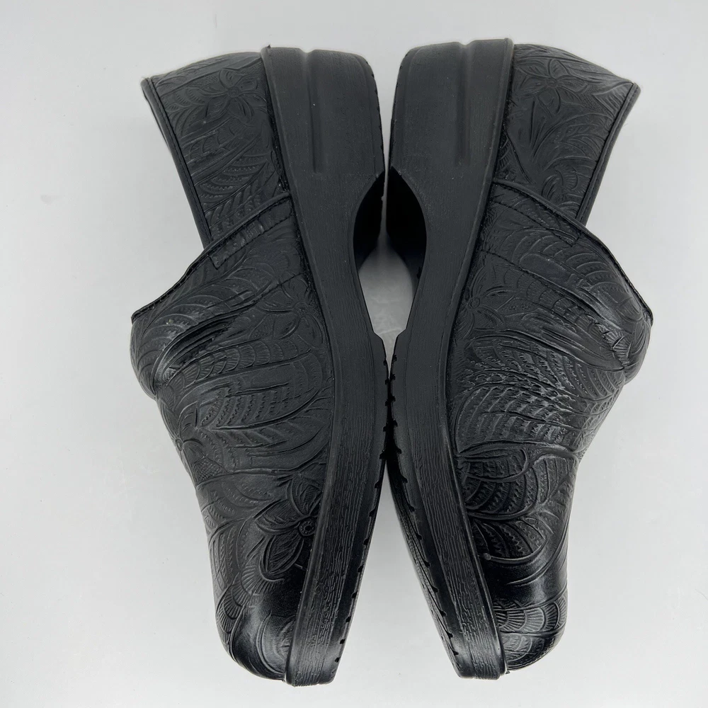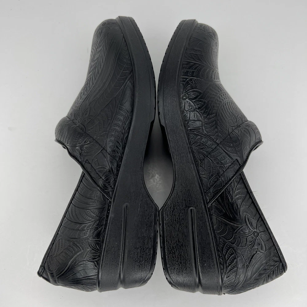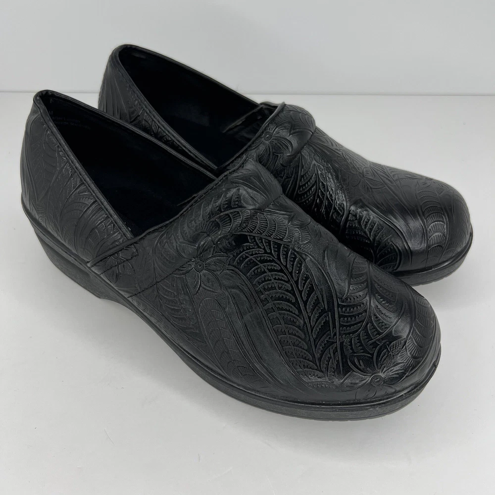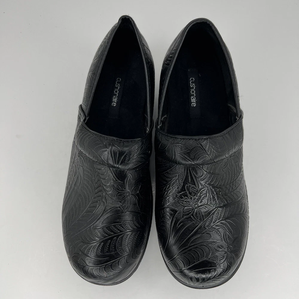Elevate your casual wardrobe with these chic black leather clogs by CUSHIONAIRE. Designed for comfort and style, these slip-on shoes feature an embossed pattern and slip-resistant rubber soles. The Claire character adds an extra touch of charm to your outfit. Perfect for any occasion, these clogs are a must-have for any fashion-forward woman. The fabric insole ensures maximum comfort, while the standard shoe width provides a perfect fit. These CUSHIONAIRE Claire clogs are sure to become your go-to shoes for everyday wear. 100% CUSTOMER SATISFACTION IS OUR GOAL! Our items are always carefully examined for condition, measured if necessary, and photographed in a climate controlled and smoke-free environment. We make every attempt to accurately describe and clearly picture the items we have for sale. Please, ALWAYS view all of the photos. We value your business and our goal is your complete satisfaction. FAST SHIPPING All items are packaged with care and shipped out the same or next business day via USPS, FEDEX, or UPS with tracking numbers so you are always informed. RETURNS We offer a 30-day return policy. All items must be unused and unopened in the condition in which they were received, with original packaging, and all accessories included for return. REVIEWS - CUSTOMER SATISFACTION - COMMUNICATION We aim to make you happy. After you receive your shipment, please leave a positive review . If you have concerns or questions about your order, please contact us so we can resolve the issue. We will do our best to make you satisfied. THANK YOU FOR YOUR BUSINESS!