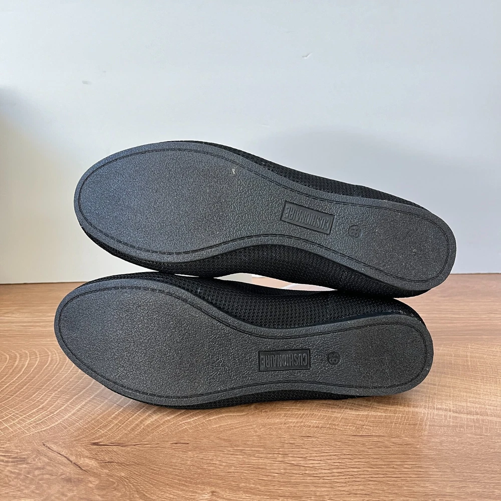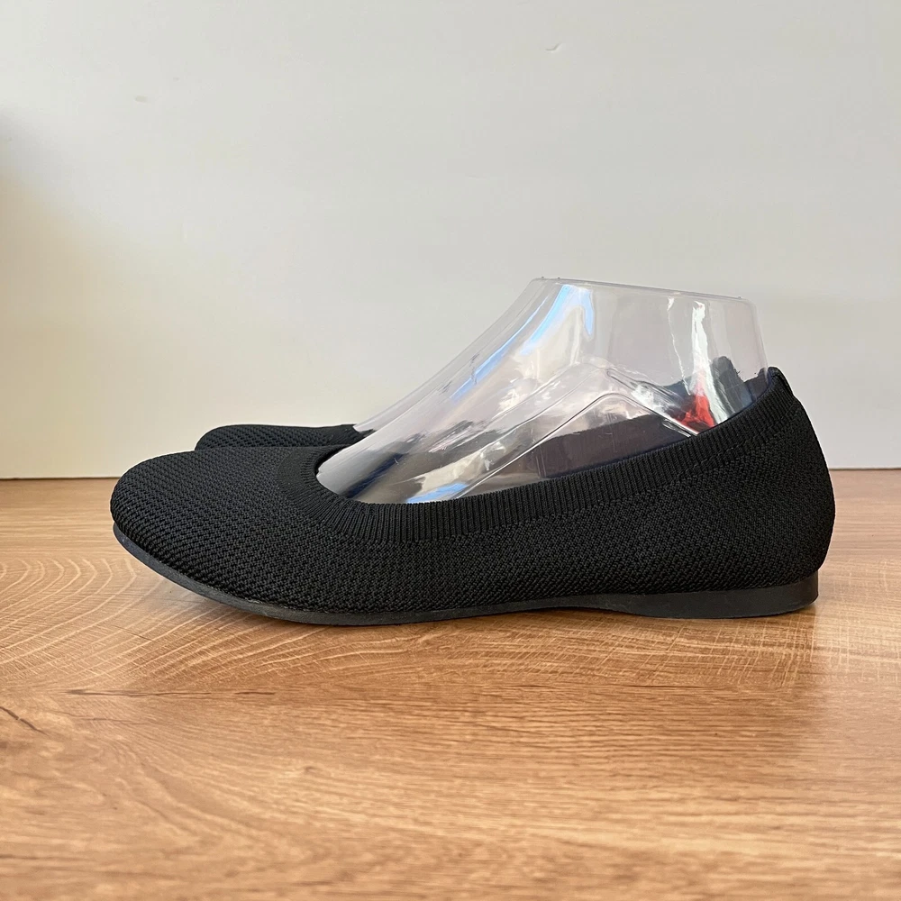 Style: Ballet Color: Black Type: Flat Department: Women Features: Comfort Occasion: Casual Outsole Material: Rubber Lining Material: Fabric Customized: No Fabric Type: Knit Upper Material: Synthetic Closure: Slip On Toe Shape: Round Toe Insole Material: Foam Vintage: No US Shoe Size: 8.5 Brand: CUSHIONAIRE Season: Fall, Summer