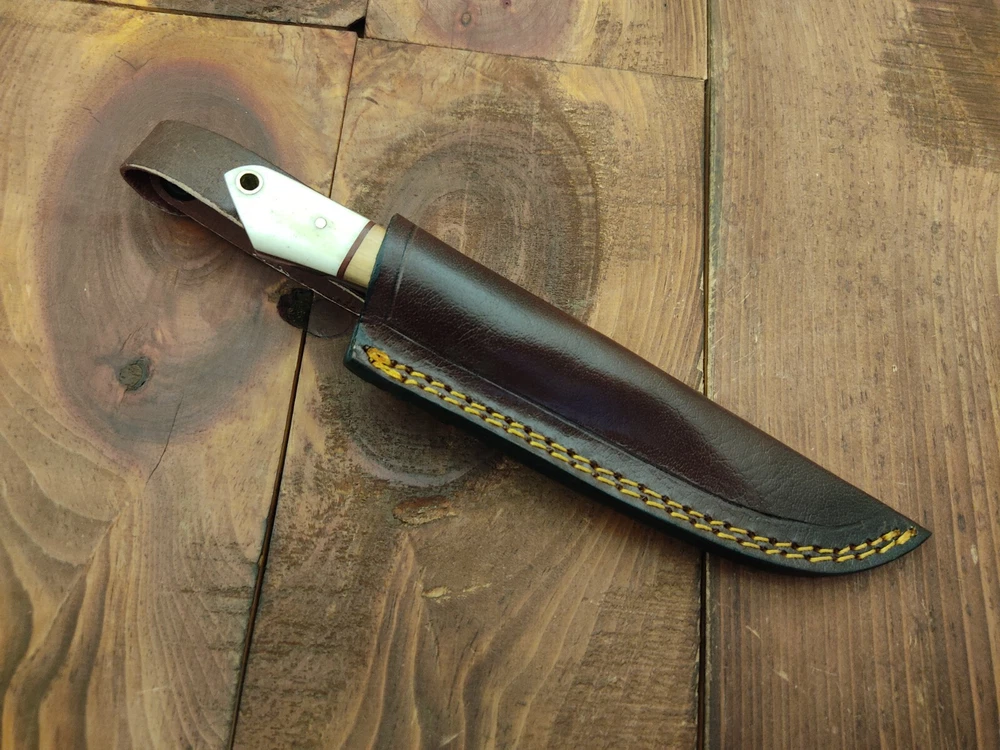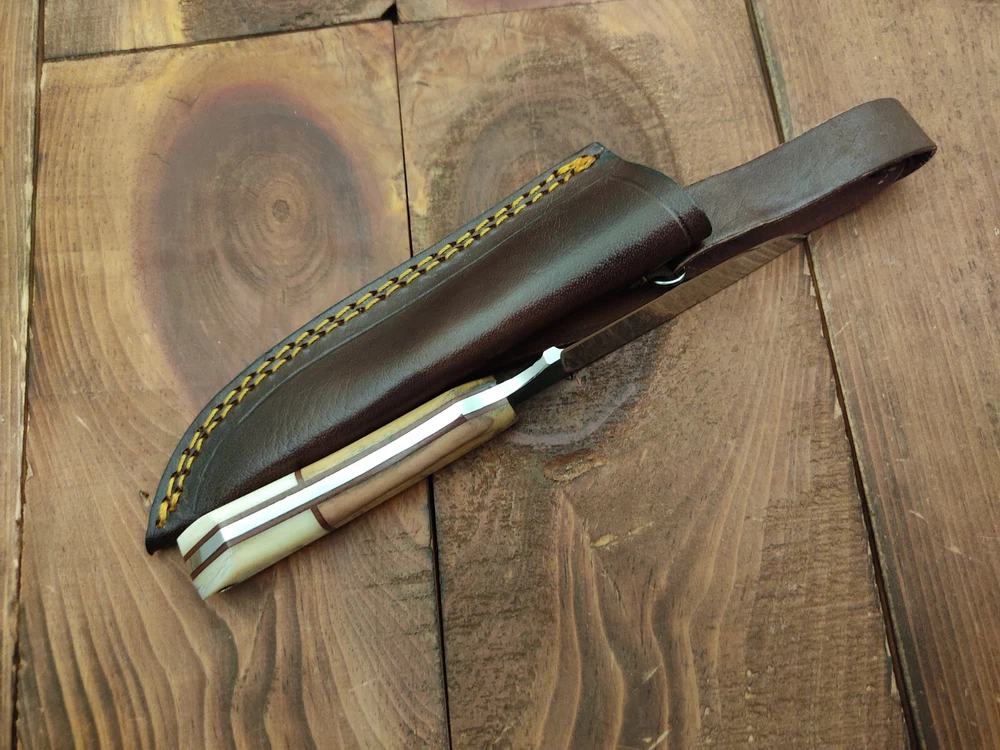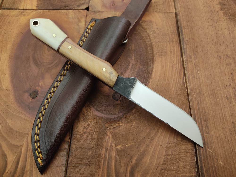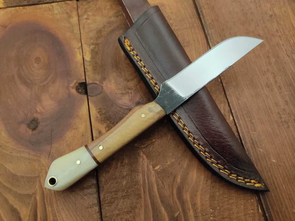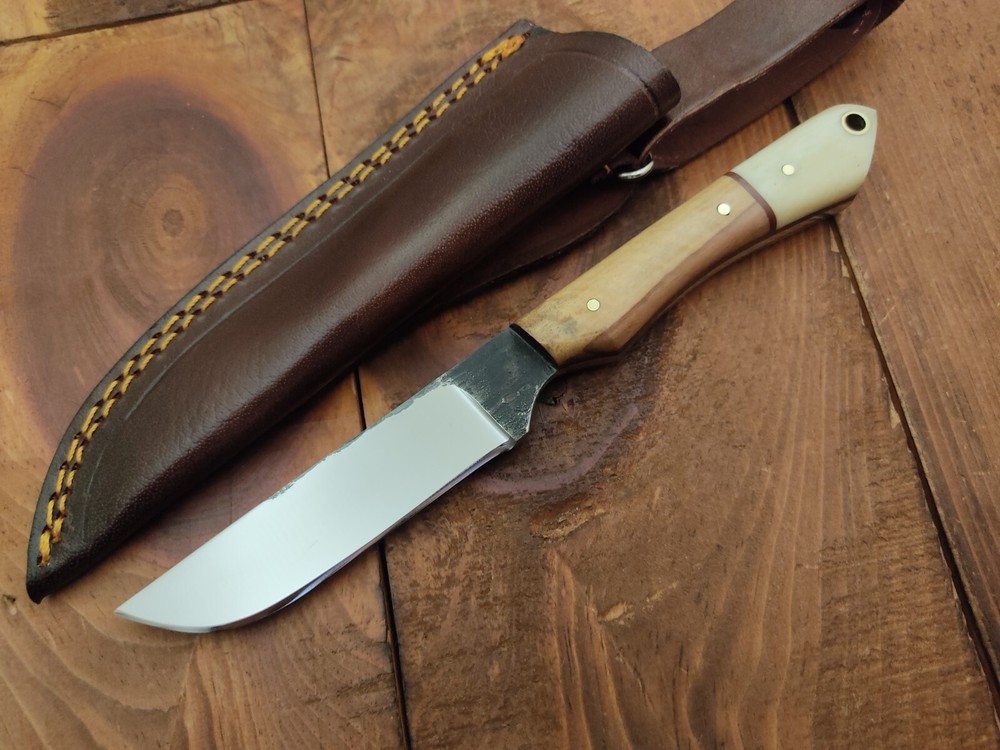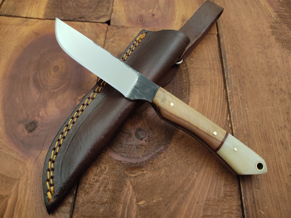 ITEM # HM-133 Fabulous Unique THUNDER STORKE Custom MADE KNIFE Custom Handmade Forged 1095 High Carbon Steel Scandi Grind Bush Craft Camping Survival Outdoor Vintage Hunting Fixed Blade Knife High Carbon Steel holds an edge very well and is optimum for hunting and skinning use as well as tactical and military tasks. The steel is very corrosive and will tarnish and turn the blade black when blood and acidic liquids or chemicals get onto the blade. The blade will still work fine, but will lose the satin color when it was new. Bone & Olive Wood Handle 1095 High Carbon Steel Blade RAZOR SHARP Gorgeous Handle & Blade 8" Long | Blade is 4" Long | Handle is 4 " 5 mm Thick Blade | Beautiful Worked Blade & Handle WORK OF ART This prestigious unique HUNTING knife was designed and custom made by THUNDERSTORKE . Blade was given excellent heat treatment and Rockwell hardness of the blade 58 to 60 . PAYMENT: As Per Ebay Requirement DISPATCH TIME: 2 to 3 DAYS AFTER RECEIVING YOUR PAYMENT COURIER / SHIPPING: When we print the postage label there is a number that is on the label. This number is called a "Delivery Confirmation Number". The post office is not like UPS or FEDX where they scan the mail at the receipt point and then track it to your door. What the post office does is scan the item when it is delivered (if they choose to) and then you will see that it was delivered. Sometimes they do scan it when you drop it off, but this is rare. If they did scan it at a sorting facility, you see it moving across the USA. But this is very rare. - eBay confuses the buyer with the "tracking number" next to the post offices "delivery confirmation number" when in reality there is not a tracking number. You can ask this at the post office and they will concur. We print labels off the internet using eBay's USPS shipping program and then we drop the packages off at the post office, similar if you were mailing a stamped letter. The post office is supposed to scan it "received" and they do this about 50% of the time. But sometimes they do not scan them. Do not worry, we did mail the item and it is on it's way to you. COMBINE SHIPPING OFFER: We Do Combine Shipping Discount On Multiple Purchase are as Follow. BUYER FEEDBACK AND Detailed Seller Ratings (DSR) SCORES : We spend a lot of time trying to describe our knives 100% perfect in detail, but sometimes we miss things. In the event that we missed something, upon inspection of the item when you receive it, let us know by contacting us via the "Contact Seller" link (next to our user ID profile) and allow us to solve your problem before leaving us low DSR scores (Detailed Seller Ratings) or neutral and negative feedback. - Help us, help ourselves to do better, with our future business on eBay by allowing us to correct our faults and fix the sale with you to a positive. We need to keep our scores high to continue to offer our great knives for sale on eBay. KNIFE CARE and SHEATHS : Leather sheaths pull moisture out of the air and tend to rust knife blades if not stored properly. When you are done using the knife, store it away from the leather sheath and put gun oil, Seal 1, or a similar protectant on the blade and store. Damascus, 1095HC, and D2 can rust and develop stains if not lubricated. AGE RESTRICTION: WE DON'T SELL KNIVES TO ANY ONE WHO IS UNDER AGE . GUARANTEE: If you are not happy with your purchase, we offer you a peace of mind guarantee if you return the product within 7 working days. We will refund your money back immediately ON RECEIVING THE KNIFE BACK IN ORIGINAL CONDITION. DELIBERATE TAMPERING WITH THE PRODUCT OR MISUSE WILL NOT QUALIFY FOR THE REFUND. SHIPPING CHARGES ARE NON-REFUNDABLE. DISCLAIMER: WHEN YOU ARE BIDDING ON THIS KNIFE YOU ARE CONFIRMING US THAT YOUR AGE QUALIFIES FOR THIS PURCHASE AND THIS IS A LEGAL PURCHASE. TAKES NO RESPONSIBILITY FOR ANY ILLEGAL PURCHASE Thank you, - Props in the Photos are NOT INCLUDED. Knife & Sheath ONLY .