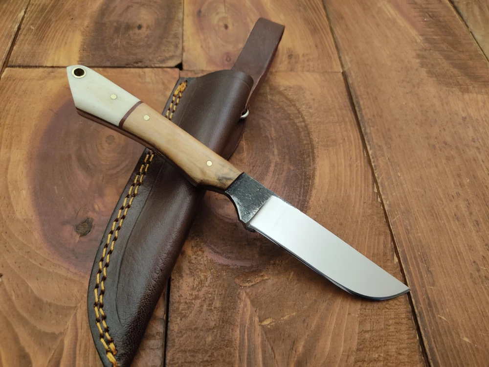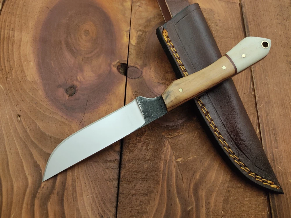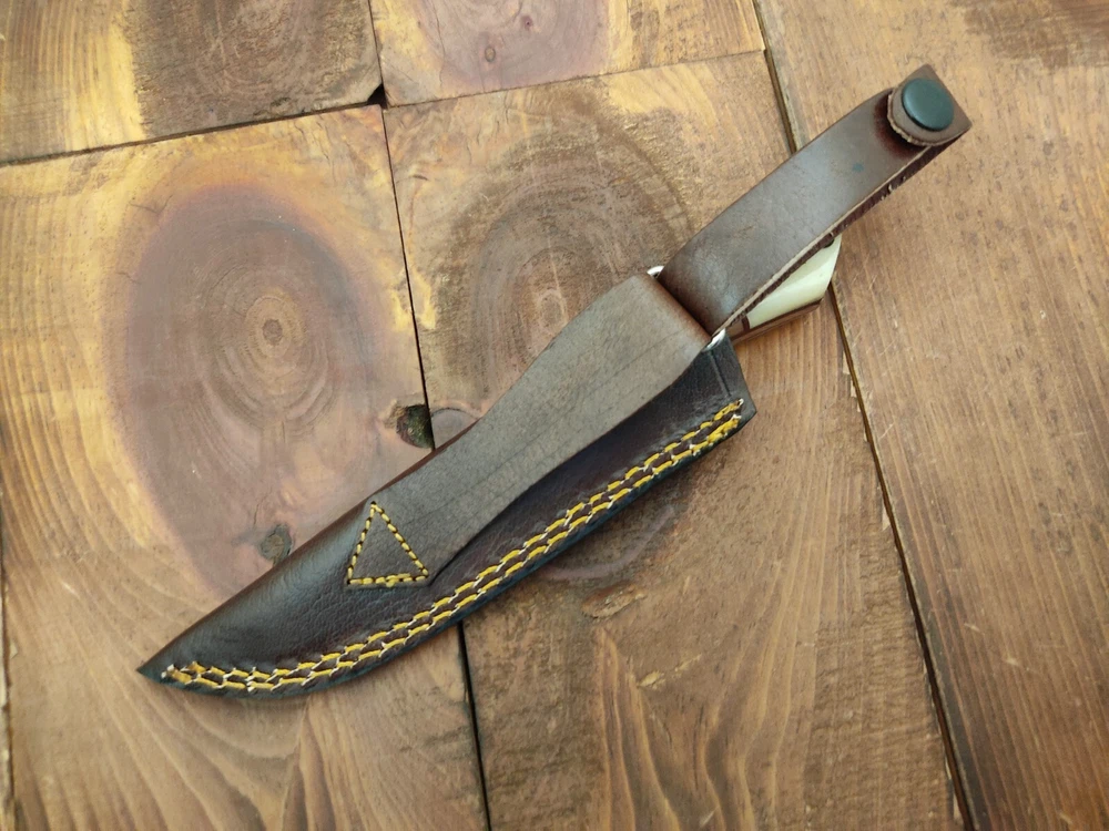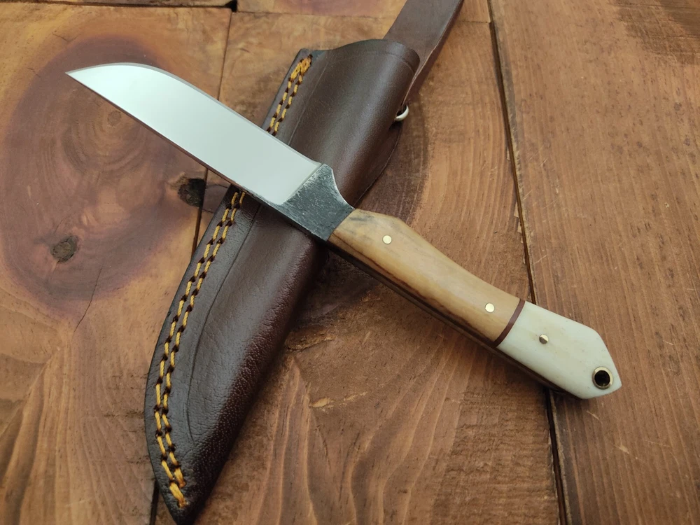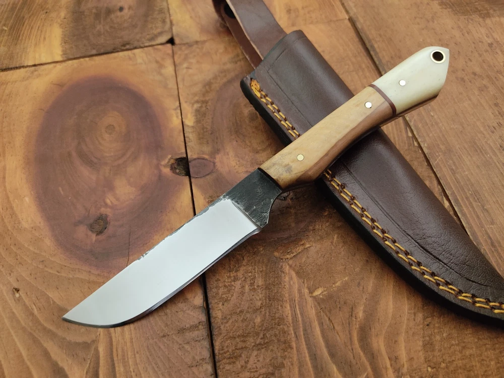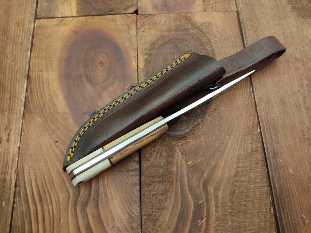 ITEM # HM-133 Fabulous Unique THUNDER STORKE Custom MADE KNIFE Custom Handmade Forged 1095 High Carbon Steel Scandi Grind Bush Craft Camping Survival Outdoor Vintage Hunting Fixed Blade Knife High Carbon Steel holds an edge very well and is optimum for hunting and skinning use as well as tactical and military tasks. The steel is very corrosive and will tarnish and turn the blade black when blood and acidic liquids or chemicals get onto the blade. The blade will still work fine, but will lose the satin color when it was new. Bone & Olive Wood Handle 1095 High Carbon Steel Blade RAZOR SHARP Gorgeous Handle & Blade 8" Long | Blade is 4" Long | Handle is 4 " 5 mm Thick Blade | Beautiful Worked Blade & Handle WORK OF ART This prestigious unique HUNTING knife was designed and custom made by THUNDERSTORKE . Blade was given excellent heat treatment and Rockwell hardness of the blade 58 to 60 . PAYMENT: As Per Ebay Requirement DISPATCH TIME: 2 to 3 DAYS AFTER RECEIVING YOUR PAYMENT COURIER / SHIPPING: When we print the postage label there is a number that is on the label. This number is called a "Delivery Confirmation Number". The post office is not like UPS or FEDX where they scan the mail at the receipt point and then track it to your door. What the post office does is scan the item when it is delivered (if they choose to) and then you will see that it was delivered. Sometimes they do scan it when you drop it off, but this is rare. If they did scan it at a sorting facility, you see it moving across the USA. But this is very rare. - eBay confuses the buyer with the "tracking number" next to the post offices "delivery confirmation number" when in reality there is not a tracking number. You can ask this at the post office and they will concur. We print labels off the internet using eBay's USPS shipping program and then we drop the packages off at the post office, similar if you were mailing a stamped letter. The post office is supposed to scan it "received" and they do this about 50% of the time. But sometimes they do not scan them. Do not worry, we did mail the item and it is on it's way to you. COMBINE SHIPPING OFFER: We Do Combine Shipping Discount On Multiple Purchase are as Follow. BUYER FEEDBACK AND Detailed Seller Ratings (DSR) SCORES : We spend a lot of time trying to describe our knives 100% perfect in detail, but sometimes we miss things. In the event that we missed something, upon inspection of the item when you receive it, let us know by contacting us via the "Contact Seller" link (next to our user ID profile) and allow us to solve your problem before leaving us low DSR scores (Detailed Seller Ratings) or neutral and negative feedback. - Help us, help ourselves to do better, with our future business on eBay by allowing us to correct our faults and fix the sale with you to a positive. We need to keep our scores high to continue to offer our great knives for sale on eBay. KNIFE CARE and SHEATHS : Leather sheaths pull moisture out of the air and tend to rust knife blades if not stored properly. When you are done using the knife, store it away from the leather sheath and put gun oil, Seal 1, or a similar protectant on the blade and store. Damascus, 1095HC, and D2 can rust and develop stains if not lubricated. AGE RESTRICTION: WE DON'T SELL KNIVES TO ANY ONE WHO IS UNDER AGE . GUARANTEE: If you are not happy with your purchase, we offer you a peace of mind guarantee if you return the product within 7 working days. We will refund your money back immediately ON RECEIVING THE KNIFE BACK IN ORIGINAL CONDITION. DELIBERATE TAMPERING WITH THE PRODUCT OR MISUSE WILL NOT QUALIFY FOR THE REFUND. SHIPPING CHARGES ARE NON-REFUNDABLE. DISCLAIMER: WHEN YOU ARE BIDDING ON THIS KNIFE YOU ARE CONFIRMING US THAT YOUR AGE QUALIFIES FOR THIS PURCHASE AND THIS IS A LEGAL PURCHASE. TAKES NO RESPONSIBILITY FOR ANY ILLEGAL PURCHASE Thank you, - Props in the Photos are NOT INCLUDED. Knife & Sheath ONLY .
