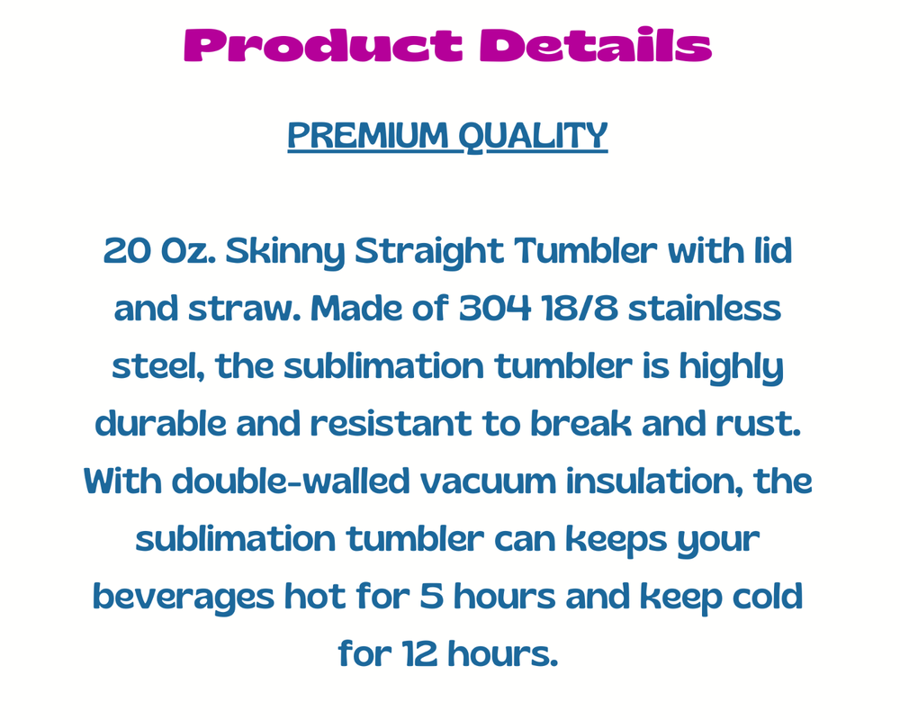 CUSTOM SKINNY STRAIGHT TUMBLER -20 OZ.- We offer premium tumbler selection for you to choose from with high-quality materials and inks to be incorporated into your desired custom tumblers and cups, making our best effort to deliver the best possible product. This listing is for ONE custom-made Tumbler with Up to 4 photos and your name or text You can personalize your 20 Oz. Skinny Tumbler mug with your Name or Text Just let us know what you want to print on it in the message box. The more you text the smaller your font will be. We print as submitted. Please double-check your spelling. Tumbler Care: Hand Wash Only. These 20 Oz. Skinny Straight Tumblers are double-wall stainless steel with a lid, straw, and straw brush. PREMIUM QUALITY: Made of 304 18/8 stainless steel, is highly durable and resistant to break and rust. With double-walled vacuum insulation, the tumbler can keep your beverages hot for 5 hours and keep them cold for 12 hours. They are individually boxed. Gift-ready and delicate packages. These high-quality tumblers are perfect for promotions, gifts, personal keepsakes, and much more. It could be an ideal gift choice for most occasions, the best way to keep your memories alive or take it on the go. Just print a personalized message on these tumblers. You Click It.. We Stamp It.!! Returns All Sales of Custom Products are FINAL due to the customization of Items. No refund, No exchange . Return will only be accepted for non-personalized items or damaged products. Buyers assume the shipping cost for non-personalized items returns. Shipping Policy Buyers are responsible for providing a secure place for dropping off the package. If your neighborhood is not safe, please route your package to another safe address. Trademark Logo Policy All trademark Logos must have a reproduction document provided by the buyer. Buyers take ALL the responsibility for all trademark Logos. PLEASE USE EBAY MESSAGE TO SEND US YOUR PERSONALIZATION INSTRUCTIONS WITHIN TWO DAYS OF PLACING YOUR ORDER. IF WE DO NOT RECEIVE IT, WE ASSUME YOU DON'T WANT ANY CUSTOMIZATION ITEMS AND WE WILL SEND YOU YOUR PURCHASED ITEM NOT PERSONALIZED. THANK YOU FOR CHOOSING US.