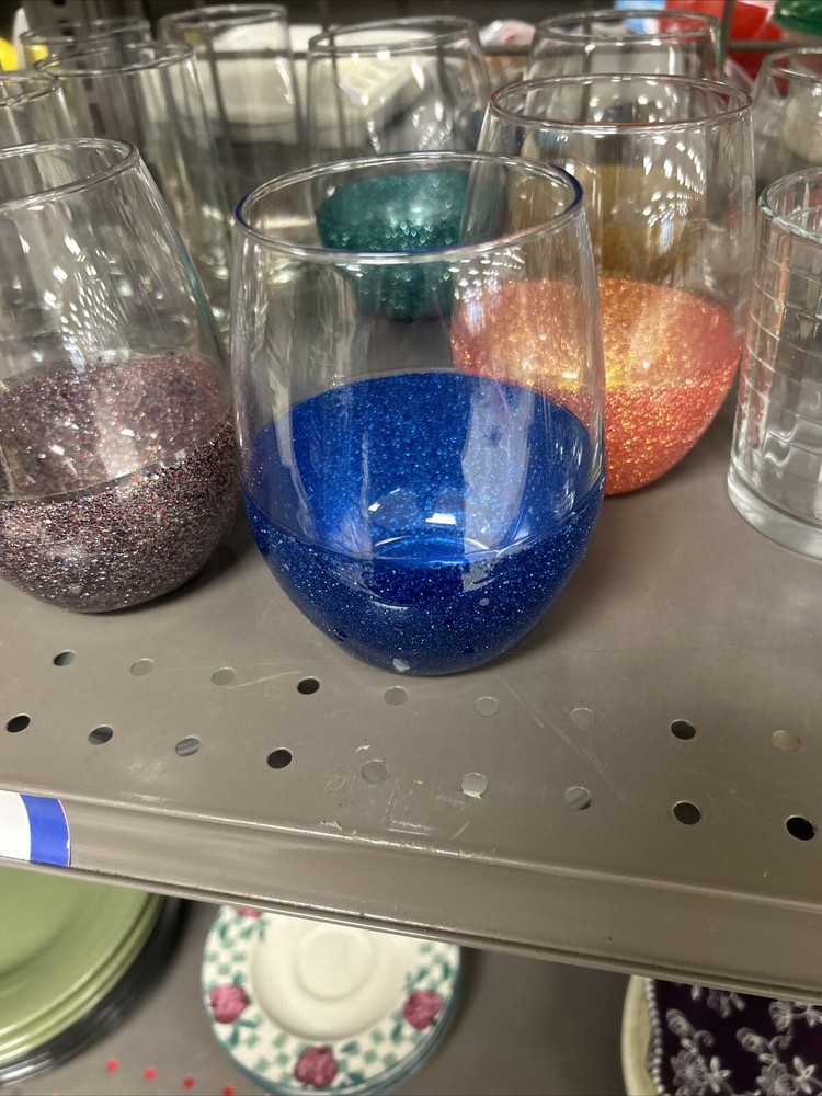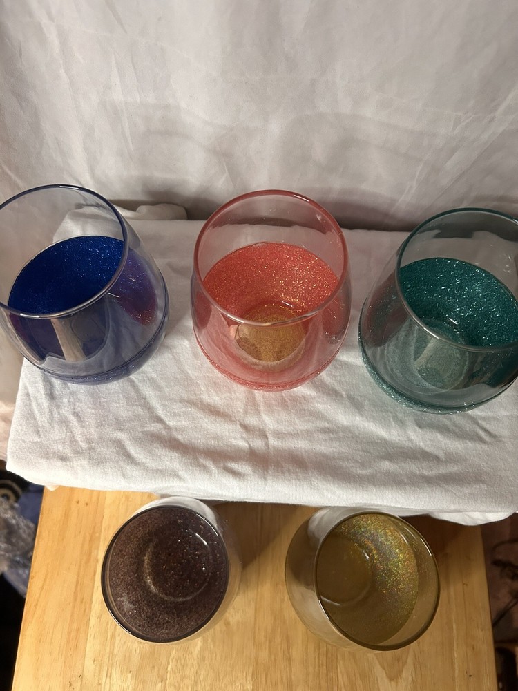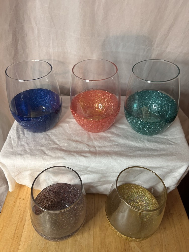 The product is a set of 5 custom wine glasses/tumblers in a variety of colors including pink, green, blue, gold, and silver. Each glass has a height of 5 inches and a capacity of 21 ounces. The glasses are made of silver material and are designed as tumblers, suitable for enjoying wine or other beverages. The versatile color options make this set a stylish addition to any home bar or kitchen, perfect for entertaining or everyday use. With glitter on the inside