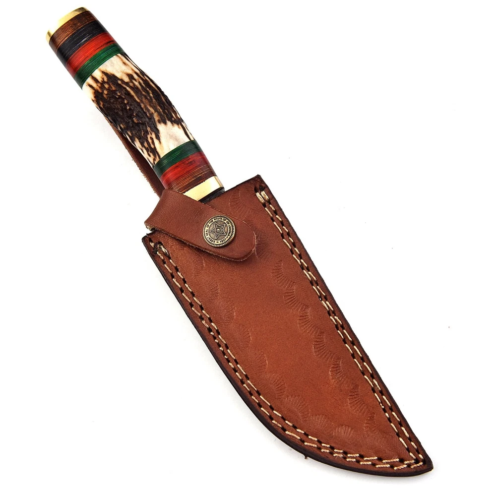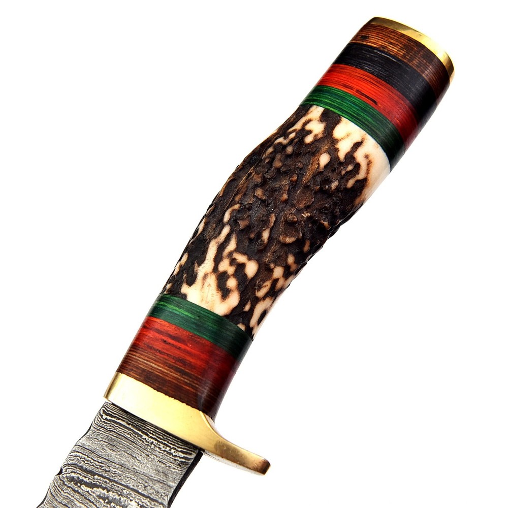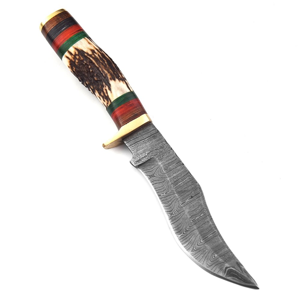 Description: CUSTOM HANDMADE HAND FORGED STAG HORN DAMASCUS STEEL Hunting KNIFE Specifications: Handle Material : Stag Horn + Brass Blade Material : Damascus steel Overall Length : 9.75 inches Handle Length : 5.5 inches Blade Length : 4.25 inches Layers: 512 Sheath: Leather Hardness: 55-58 HRC This superb design knife is hand forged. Blade of this knife has a nice file work and is made of 512 layers of stainless steel and high carbon steel with hardness 55-60 HRC. This process takes approximately 48 hours to complete. This robust knife is lab tested under intense conditions, the balance and shape of this knife ensures perfect grip. All our knives are handmade similar to the photo, differences as such as color and patterns of the natural materials used will differ somewhat because these are all natural materials. Every item will be considered as an original because no one item is ever identical to the other, they are handmade and natural materials are never identical. Because they are handmade they may have slight imperfections because they are NEVER MACHINE MADE and this makes it original in its own way. Package Includes: Knife with Original Leather Sheath AGE RESTRICTION: WE DON'T SELL KNIVES TO ANY ONE WHO IS UNDER AGE 18. WHEN YOU BUY A KNIFE FROM US YOU ARE CONFIRMING THAT YOUR AGE QUALIFIES FOR THIS PURCHASE AND THIS IS A LEGAL PURCHASE. Lift US TAKES NO RESPONSIBILITY FOR ANY ILLEGAL PURCHASE. Care Instructions: Keep the knife dry after each cleaning. Warning: Take care when removing product from packaging. Keep fingers clear of blades. Store away from children. We are not responsible for injuries caused by the use of this item. FEEDBACK POLICY: YOUR FEEDBACK IS VERY IMPORTANT FOR US, IF THEIR IS ANY KIND OF PROBLEM PLEASE GIVE US OPPORTUNITY TO SORT THE ISSUE We do sell wholesale, please contact us for special discounts on bulk orders. Best Regards TrendCutd