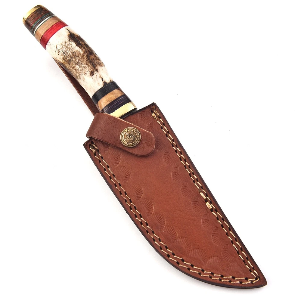 Description: CUSTOM HANDMADE HAND FORGED STAG HORN DAMASCUS STEEL Hunting KNIFE Specifications: Handle Material : Stag Horn + Brass Blade Material : Damascus steel Overall Length : 9.75 inches Handle Length : 5.5 inches Blade Length : 4.25 inches Layers: 512 Sheath: Leather Hardness: 55-58 HRC This superb design knife is hand forged. Blade of this knife has a nice file work and is made of 512 layers of stainless steel and high carbon steel with hardness 55-60 HRC. This process takes approximately 48 hours to complete. This robust knife is lab tested under intense conditions, the balance and shape of this knife ensures perfect grip. All our knives are handmade similar to the photo, differences as such as color and patterns of the natural materials used will differ somewhat because these are all natural materials. Every item will be considered as an original because no one item is ever identical to the other, they are handmade and natural materials are never identical. Because they are handmade they may have slight imperfections because they are NEVER MACHINE MADE and this makes it original in its own way. Package Includes: Knife with Original Leather Sheath AGE RESTRICTION: WE DON'T SELL KNIVES TO ANY ONE WHO IS UNDER AGE 18. WHEN YOU BUY A KNIFE FROM US YOU ARE CONFIRMING THAT YOUR AGE QUALIFIES FOR THIS PURCHASE AND THIS IS A LEGAL PURCHASE. Lift US TAKES NO RESPONSIBILITY FOR ANY ILLEGAL PURCHASE. Care Instructions: Keep the knife dry after each cleaning. Warning: Take care when removing product from packaging. Keep fingers clear of blades. Store away from children. We are not responsible for injuries caused by the use of this item. FEEDBACK POLICY: YOUR FEEDBACK IS VERY IMPORTANT FOR US, IF THEIR IS ANY KIND OF PROBLEM PLEASE GIVE US OPPORTUNITY TO SORT THE ISSUE We do sell wholesale, please contact us for special discounts on bulk orders. Best Regards TrendCutd