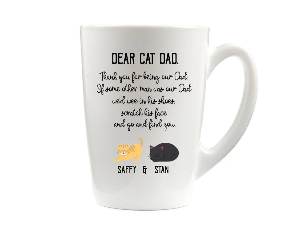 Personalized Cat Dad Mug Custom Cat Coffee Mug Gift For Cat Dad Funny Cat Lovers Product Details.. This high quality 11oz. ceramic white mug has a premium hard coat that provides crisp and vibrant color reproduction sure to last for years. Perfect for all hot & cold beverages. The highest quality printing possible is used. It will never fade no matter how many times you wash it. Material: 100% Ceramic. Print both sides. Dishwasher and Microwave Safe. High Gloss + Premium White Finish. Printed in the U.S.A. Personalized & Custom. We support personalized and custom mug to add custom, when placing an order, you can add notes to the "order note" in shipping address section. Also you can contact us directly via message. Shipping Info. Ready to ship in 1 to 2 business days, All products are made-to-order and proudly printed in the United States. Shipped by USPS and DHL, You will receive your order in 5-7 days. Replace & Refund. All products are defective during shipping broken, chipped will be replaced free of charge. You are not satisfied with the product, we will refund 100% money to you. If any other issues arise, please do not hesitate to message, we would be more than happy to assist you.