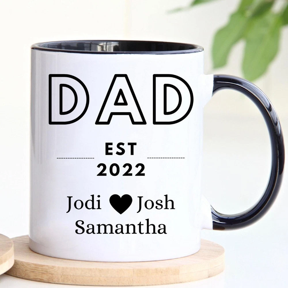 Custom Dad Mug With Kids Names Personalized Custom Dad Mug Dad Est Mug Fathers Product Details.. This high quality 11oz. ceramic white mug has a premium hard coat that provides crisp and vibrant color reproduction sure to last for years. Perfect for all hot & cold beverages. The highest quality printing possible is used. It will never fade no matter how many times you wash it. Material: 100% Ceramic. Print both sides. Dishwasher and Microwave Safe. High Gloss + Premium White Finish. Printed in the U.S.A. Personalized & Custom. We support personalized and custom mug to add custom, when placing an order, you can add notes to the "order note" in shipping address section. Also you can contact us directly via message. Shipping Info. Ready to ship in 1 to 2 business days, All products are made-to-order and proudly printed in the United States. Shipped by USPS and DHL, You will receive your order in 5-7 days. Replace & Refund. All products are defective during shipping broken, chipped will be replaced free of charge. You are not satisfied with the product, we will refund 100% money to you. If any other issues arise, please do not hesitate to message, we would be more than happy to assist you.