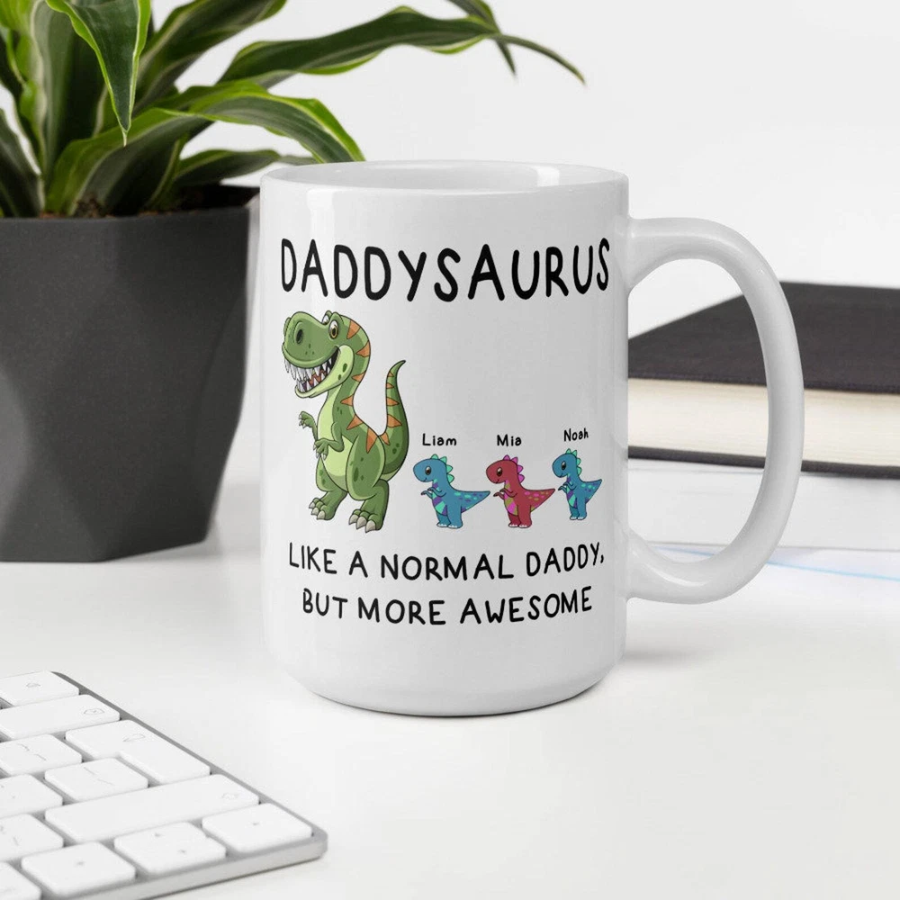 Custom Daddysaurus Mug Personalized Mug For Dadsaurus Papasaurus Coffee Mug Product Details.. This high quality 11oz. ceramic white mug has a premium hard coat that provides crisp and vibrant color reproduction sure to last for years. Perfect for all hot & cold beverages. The highest quality printing possible is used. It will never fade no matter how many times you wash it. Material: 100% Ceramic. Print both sides. Dishwasher and Microwave Safe. High Gloss + Premium White Finish. Printed in the U.S.A. Personalized & Custom. We support personalized and custom mug to add custom, when placing an order, you can add notes to the "order note" in shipping address section. Also you can contact us directly via message. Shipping Info. Ready to ship in 1 to 2 business days, All products are made-to-order and proudly printed in the United States. Shipped by USPS and DHL, You will receive your order in 5-7 days. Replace & Refund. All products are defective during shipping broken, chipped will be replaced free of charge. You are not satisfied with the product, we will refund 100% money to you. If any other issues arise, please do not hesitate to message, we would be more than happy to assist you.