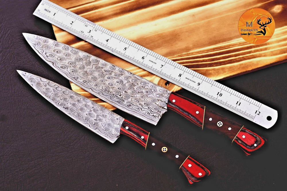 CUSTOM HAND MADE HAND FORGED DAMASCUS STEEL BLADE CHEF KNIFE STE Wood Handle This superb design knife is hand forged. Blade of this knife has a nice file work and is made of 512 layers of 4340 stainless steel and 1075 high carbon steel and hardness 55-58 HRC . This robust knife is lab tested under intense conditions, the balance and shape of this knife ensures perfect grip. Overall Pieces : 2 Chef Knife : Blade 7.5" Inches - Handle 5" Inches Steak Knife : Blade 4.5" Inches - Handle 4.5" Inches Damascus Design: Rain Drop Pattern Layers: 512 Care Instructions: Keep the knife dry after each cleaning. Warning: Keep fingers clear of blades. Store away from children.