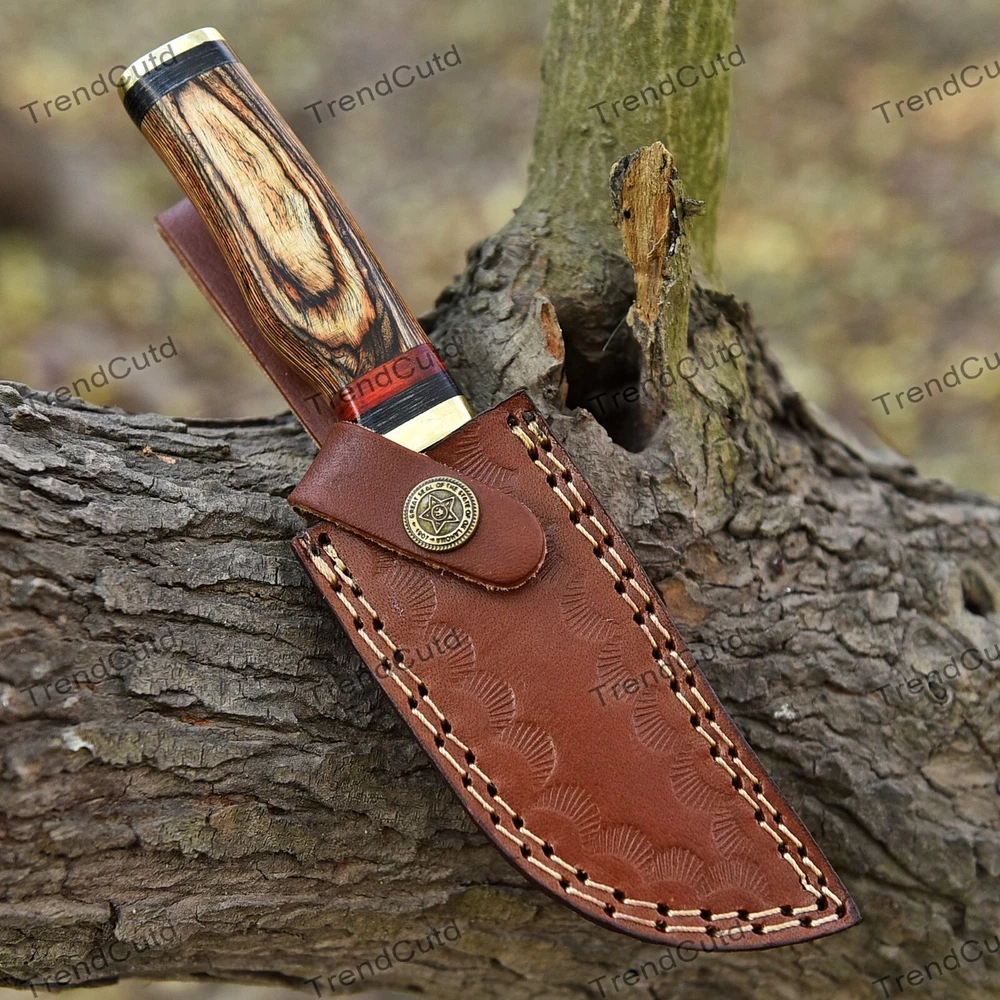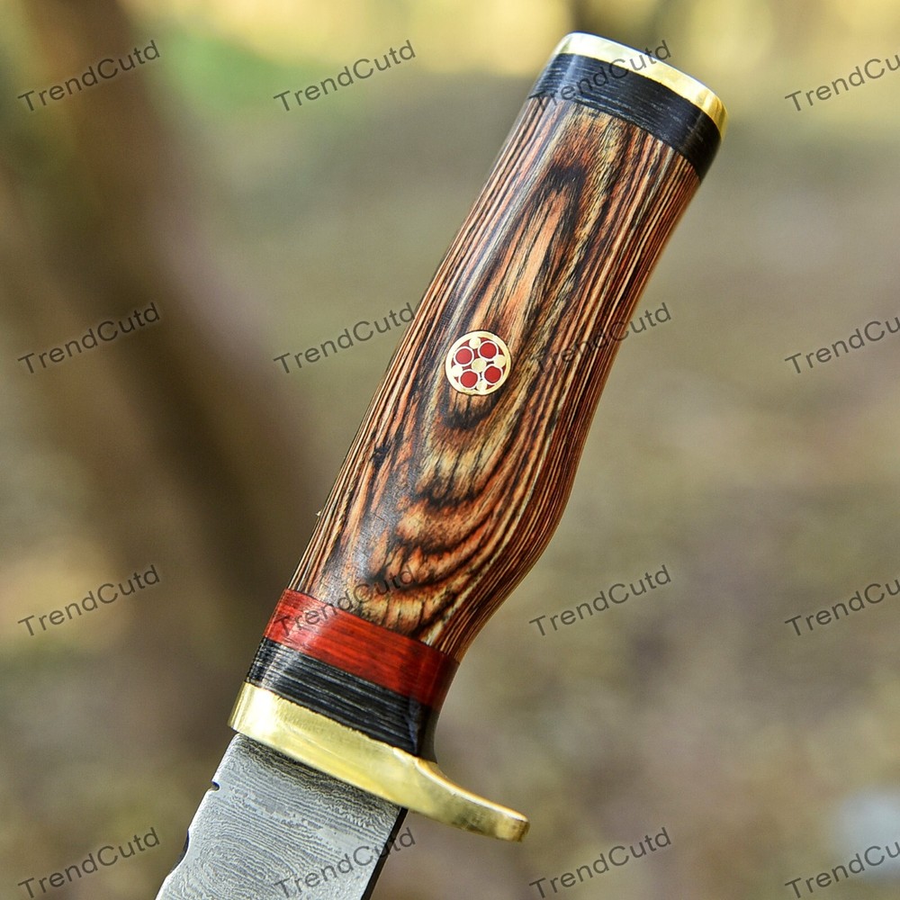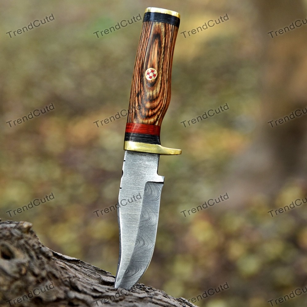 Custom Handmade Damascus Steel Skinner Hunting Knife KNIFE MATERIAL: Blade: Damascus Handle: Pakka Wood & Brass Pommal & Brass Guard KNIFE MEASUREMENT: Overall Length= 8" Blade Length= 4" Handle Length=4" Trendcutd knives are handmade you will get the same knife as in the photo. A slight difference can be there in color and patterns because these are handmade items and we use natural material. These knife have perfect grip sharp cutting edge which makes our knives more durable. Tips To Care For Knife: 1. Clean your knife with gasoline or Ethanol after use. 2. Apply oil on the blade after cleaning & using the knife. 3. Never store the knife in sheath for long time as it may dull the sharpness of knife over time. DISCLAIMER: If you have any issue regarding our products and services you can always contact us any time we will try to resolve your issue as quickly as possible. Best Regards, Trendcutd