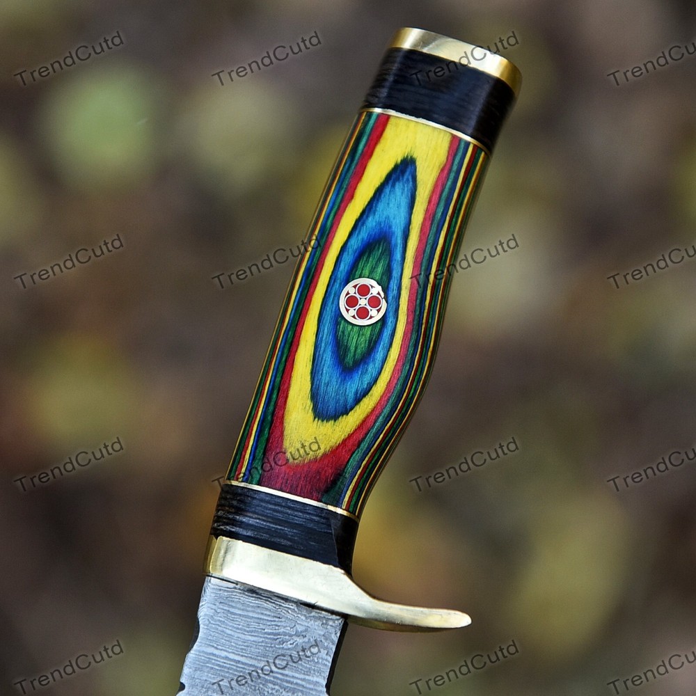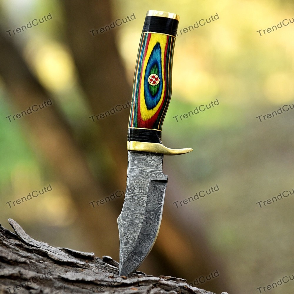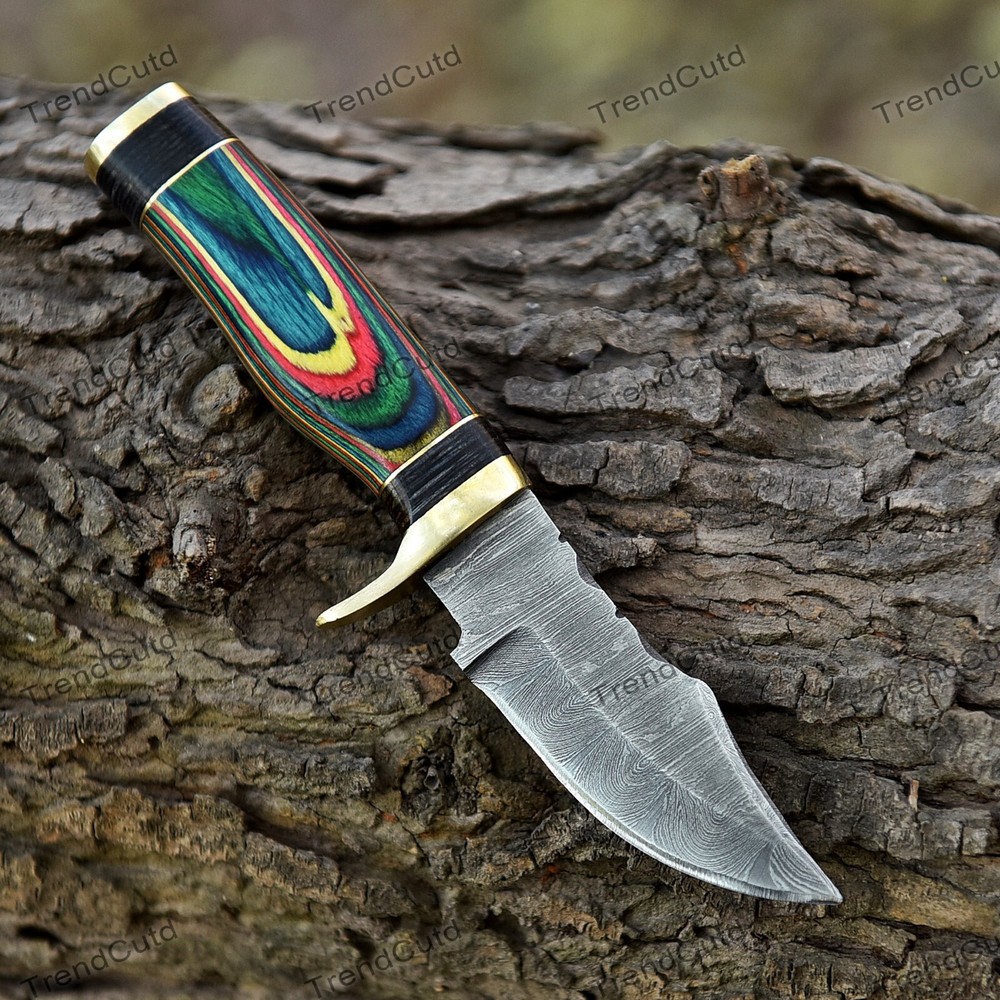 Custom Handmade Damascus Steel Skinner Hunting Knife KNIFE MATERIAL: Blade: Damascus Handle: Pakka Wood & Brass Pommal & Brass Guard KNIFE MEASUREMENT: Overall Length= 6" Blade Length= 3" Handle Length=3" Trendcutd knives are handmade you will get the same knife as in the photo. A slight difference can be there in color and patterns because these are handmade items and we use natural material. These knife have perfect grip sharp cutting edge which makes our knives more durable. Tips To Care For Knife: 1. Clean your knife with gasoline or Ethanol after use. 2. Apply oil on the blade after cleaning & using the knife. 3. Never store the knife in sheath for long time as it may dull the sharpness of knife over time. DISCLAIMER: If you have any issue regarding our products and services you can always contact us any time we will try to resolve your issue as quickly as possible. Best Regards, Trendcutd