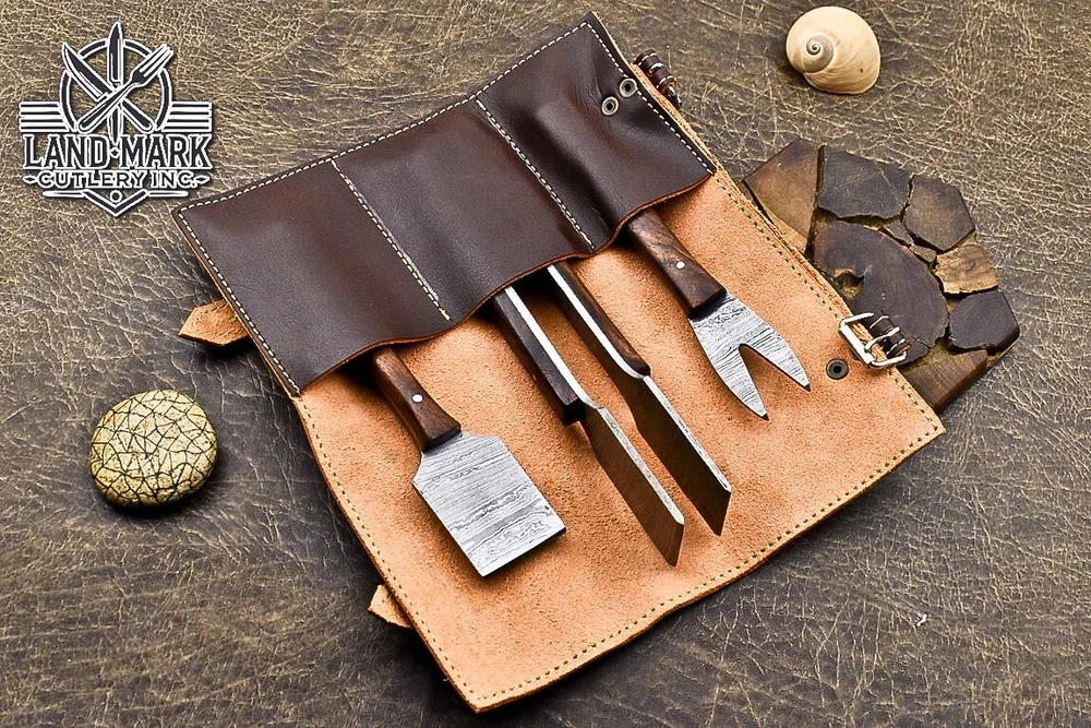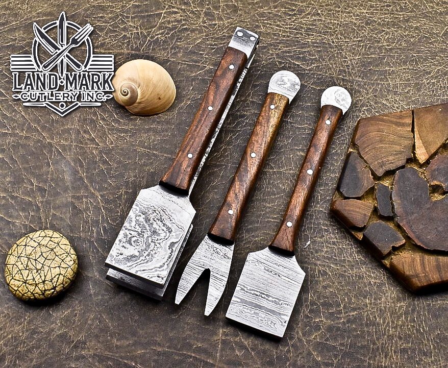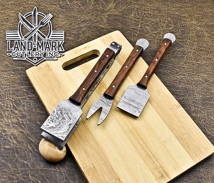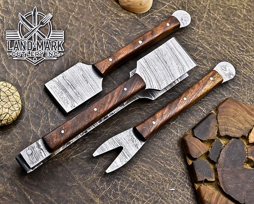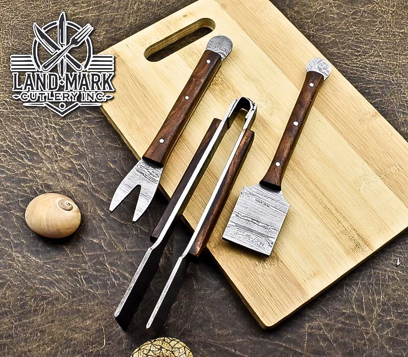Custom Hand Made DAMASCUS STEEL HUNTING BBQ SET WITH ROSE WOOD HANDLE We offer a shipping discount for More then one purchased . And discount will be apply on combine invoice, Discount will not apply on separate payment. ITEM DETAILS OVER ALL LENGTH 12.0 inches long (Approx) BLADE HARDNESS 58-60 HRC Which Holds The Sharp Edge For Long Time. HANDLE ROSE WOOD COVER NO This Awesome custom made KNIFE has a nice hand forged with the combination of 4340 & 1080 steel. HOW OUR DAMASCUS IS MADE: All our Damascus is real and not just an acid etch. Damascus is a mixture of 1080HC and 4340 nickel carbon. You heat them up together and then fold the bar over and over to get the desired layers, ours are 396 layers. Then you burn the blade in acid, and it turns the nickel satin color and the high carbon turns blackish gray. This is how the layers are exposed to show the layers of the new steel created coined "Damascus". All Damascus is acid etched to show the layers. If you high polish the metal it will be shinny satin like all steels. Only after you burn the sides of the blade with acid do you see the layers of the two steels. Makes sense? After we make our knives we high polish the handles and put an edge on the blade. The high polishing buffs off the acid burned layer of the handle, and the blade edge is sharpened and the acid burned edge becomes satin. You can re-burn the tang of the blade near the handles and the edge of the blade and it will show the layers once more. All our knives are hand made, durable and unique ***** YOU WILL RECEIVED THE SAME KNIFE Qality Standards Our Damascus blades are made from high quality non-stainless steels which rival or exceed any Damascus blade made from the 10 series with 4340. Our Damascus combination has taken years to perfect and has been tested under a variety of application which will offer professional performance in categories of toughness, strength (lateral stress) and edge honing and holding ability. In a 5 spot Rockwell test our blades will average near or close to 58 which offers a perfect balances between its toughness and strength.Our blades due to carbon content need to be regularly treated with wax and/or 3 in 1 oil to maintain its superior quality. Questions if you have any question feel free to send us message we aim to answer all questions within 24 hours Feedback If you are not satisfied with our service please contact us before leaving any negative or natural feedback. We will resolve all issues as quickly as possible. Disclaimer We are not responsible for any injuries associated with the use of our tools. Our products are intended for legal use only by responsible buyers. Therefore, we will not sell our products to anyone under the age of 18. Before bidding please check your country laws as some countries Custom don't allow this. If your purchase is held by Custom Authorities in your country/State we will not be responsible for that and no refund will be issued Shipping We offer a 20% shipping discount for More then one purchased . And discount will be apply on combine invoice, Discount will not apply on separate payment We ship within 24 hours after receiving complete payment but this can be delayed due to week ends or Governments and Religious Festivals . . This is beyond our control and we apologize for this inconvenience. Precautions Our Tools are very sharp so open and use them very carefully We are not responsible for any injuries associated with the use of our tools Tips to Care knife 1. NEVER STORE YOUR KNIFE FOR LONG TIME IN LEATHER SHEATH. 2. LEATHER CAN ABSORB WATER, WHICH WILL RUST THE KNIFE. 3. ALWAYS CLEAN THE BLADE AFTER USING WITH OIL OR WAX