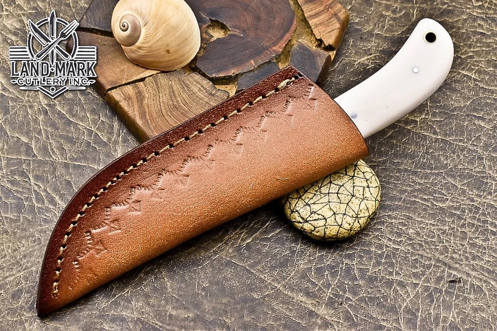 Custom Hand Made DAMASCUS STEEL HUNTING KNIFE WITH WHITE HANDLE We offer a shipping discount for More then one purchased . And discount will be apply on combine invoice, Discount will not apply on separate payment. ITEM DETAILS OVER ALL LENGTH 8.0 inches long (Approx) HANDLE LENGTH 4.0 inches long (Approx) BLADE LENGTH 4.0 inches long (Approx) BLADE HARDNESS 58-60 HRC Which Holds The Sharp Edge For Long Time. HANDLE RESIN COVER LEATHER SHEATH This Awesome custom made KNIFE has a nice hand forged with the combination of 4340 & 1080 steel. HOW OUR DAMASCUS IS MADE: All our Damascus is real and not just an acid etch. Damascus is a mixture of 1080HC and 4340 nickel carbon. You heat them up together and then fold the bar over and over to get the desired layers, ours are 396 layers. Then you burn the blade in acid, and it turns the nickel satin color and the high carbon turns blackish gray. This is how the layers are exposed to show the layers of the new steel created coined "Damascus". All Damascus is acid etched to show the layers. If you high polish the metal it will be shinny satin like all steels. Only after you burn the sides of the blade with acid do you see the layers of the two steels. Makes sense? After we make our knives we high polish the handles and put an edge on the blade. The high polishing buffs off the acid burned layer of the handle, and the blade edge is sharpened and the acid burned edge becomes satin. You can re-burn the tang of the blade near the handles and the edge of the blade and it will show the layers once more. All our knives are hand made, durable and unique ***** YOU WILL RECEIVED THE SAME KNIFE Qality Standards Our Damascus blades are made from high quality non-stainless steels which rival or exceed any Damascus blade made from the 10 series with 4340. Our Damascus combination has taken years to perfect and has been tested under a variety of application which will offer professional performance in categories of toughness, strength (lateral stress) and edge honing and holding ability. In a 5 spot Rockwell test our blades will average near or close to 58 which offers a perfect balances between its toughness and strength.Our blades due to carbon content need to be regularly treated with wax and/or 3 in 1 oil to maintain its superior quality. Questions if you have any question feel free to send us message we aim to answer all questions within 24 hours Feedback If you are not satisfied with our service please contact us before leaving any negative or natural feedback. We will resolve all issues as quickly as possible. Disclaimer We are not responsible for any injuries associated with the use of our tools. Our products are intended for legal use only by responsible buyers. Therefore, we will not sell our products to anyone under the age of 18. Before bidding please check your country laws as some countries Custom don't allow this. If your purchase is held by Custom Authorities in your country/State we will not be responsible for that and no refund will be issued Shipping We offer a 20% shipping discount for More then one purchased . And discount will be apply on combine invoice, Discount will not apply on separate payment We ship within 24 hours after receiving complete payment but this can be delayed due to week ends or Governments and Religious Festivals . . This is beyond our control and we apologize for this inconvenience. Precautions Our Tools are very sharp so open and use them very carefully We are not responsible for any injuries associated with the use of our tools Tips to Care knife 1. NEVER STORE YOUR KNIFE FOR LONG TIME IN LEATHER SHEATH. 2. LEATHER CAN ABSORB WATER, WHICH WILL RUST THE KNIFE. 3. ALWAYS CLEAN THE BLADE AFTER USING WITH OIL OR WAX