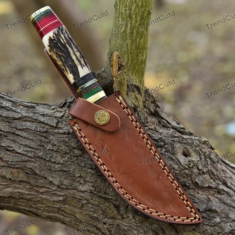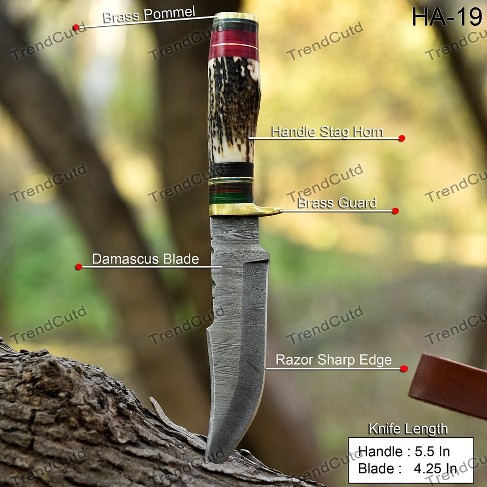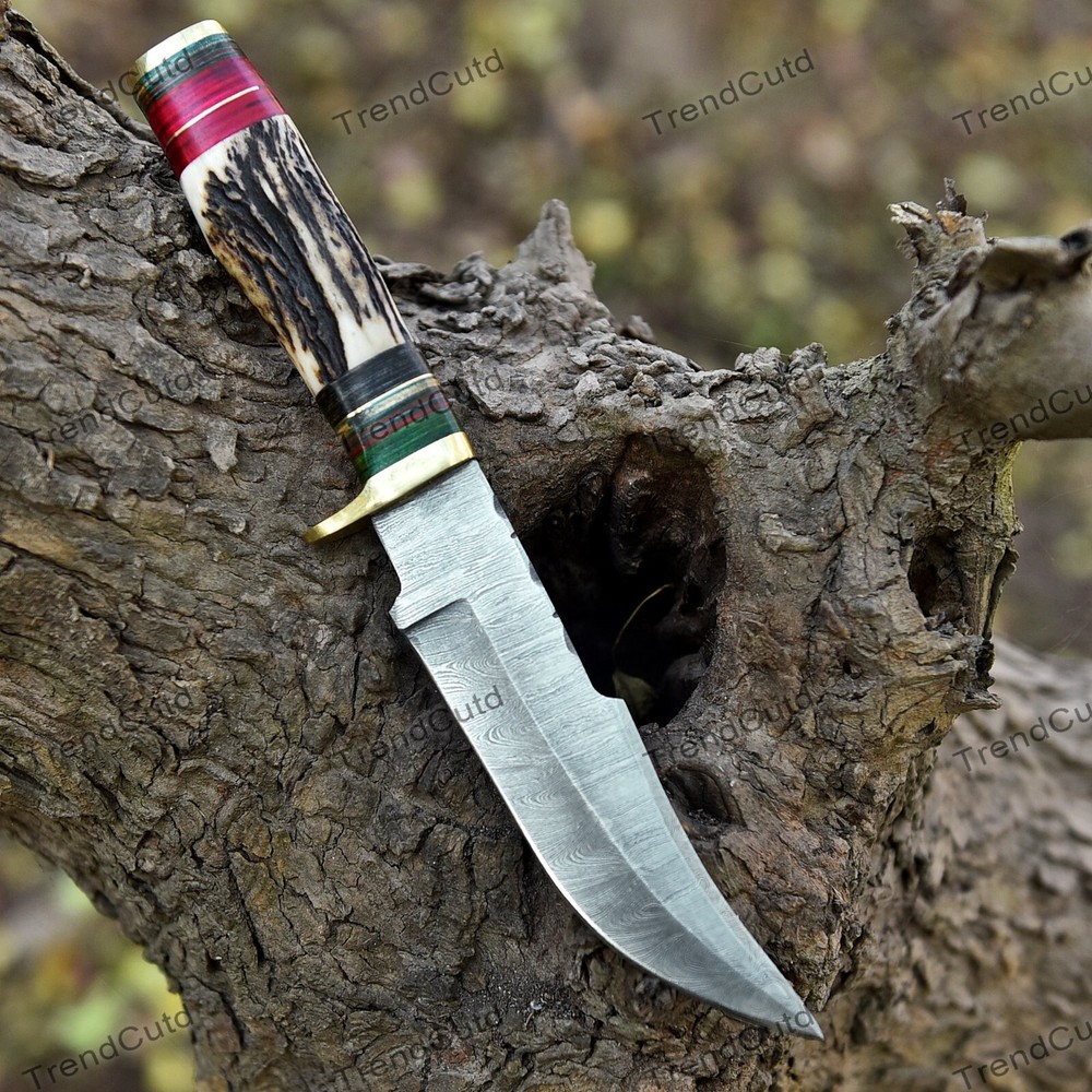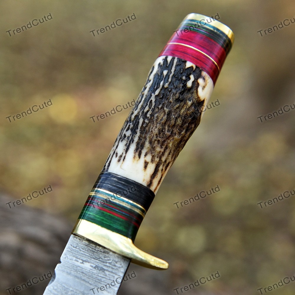 Description: CUSTOM HANDMADE HAND FORGED STAG HORN DAMASCUS STEEL Hunting KNIFE Specifications: Handle Material : Stag Horn + Brass Blade Material : Damascus steel Overall Length : 9.75 inches Handle Length : 5.5 inches Blade Length : 4.25 inches Layers: 512 Sheath: Leather Hardness: 55-58 HRC This superb design knife is hand forged. Blade of this knife has a nice file work and is made of 512 layers of stainless steel and high carbon steel with hardness 55-60 HRC. This process takes approximately 48 hours to complete. This robust knife is lab tested under intense conditions, the balance and shape of this knife ensures perfect grip. All our knives are handmade similar to the photo, differences as such as color and patterns of the natural materials used will differ somewhat because these are all natural materials. Every item will be considered as an original because no one item is ever identical to the other, they are handmade and natural materials are never identical. Because they are handmade they may have slight imperfections because they are NEVER MACHINE MADE and this makes it original in its own way. Package Includes: Knife with Original Leather Sheath AGE RESTRICTION: WE DON'T SELL KNIVES TO ANY ONE WHO IS UNDER AGE 18. WHEN YOU BUY A KNIFE FROM US YOU ARE CONFIRMING THAT YOUR AGE QUALIFIES FOR THIS PURCHASE AND THIS IS A LEGAL PURCHASE. Lift US TAKES NO RESPONSIBILITY FOR ANY ILLEGAL PURCHASE. Care Instructions: Keep the knife dry after each cleaning. Warning: Take care when removing product from packaging. Keep fingers clear of blades. Store away from children. We are not responsible for injuries caused by the use of this item. FEEDBACK POLICY: YOUR FEEDBACK IS VERY IMPORTANT FOR US, IF THEIR IS ANY KIND OF PROBLEM PLEASE GIVE US OPPORTUNITY TO SORT THE ISSUE We do sell wholesale, please contact us for special discounts on bulk orders. Best Regards TrendCutd
