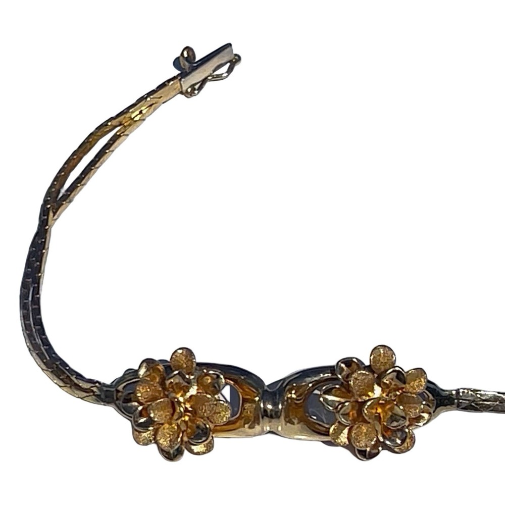 This elegant gold floral Bracelet adds a touch of sophistication to any outfit. Perfect for special occasions or everyday wear. • Stunning Custom Designed One of a Kind Antique Flower Charm Bracelet! • 14k Fine Italian Solid Gold! • Weight: 14.7 grams. • Length: 7.5 inches. Note: Current scrap metal price for 14.7 grams is approximately $900. SERIOUS BUYERS ONLY. This listing includes one bracelet. Should you be interested in purchasing the matching necklace along with the Bracelet together, feel free to message me.