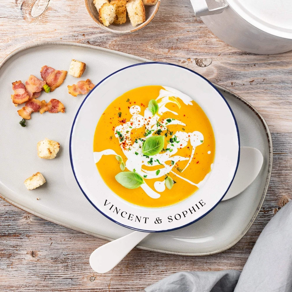 Custom Engraved Enamel Camping Retro Deep Soup Plate Custom Engraved Enamel Camping Retro Deep Soup Plate DETAILS ★ Discover the Perfect Enamel Soup Plates: Ideal for both indoor and outdoor dining: Enjoy your favourite meals with our distinctive Enamel Plates. Whether it's a personalised plate that brings a traditional style to your table or an adventurer's enamel plate perfect for camping and picnics, these plates are a must-have. They make a wonderful gift for the adventurer in the family or any friend who loves the outdoors! Perfect for hiking trips, camping weekends, lazy beach days, and picnics, these plates add a unique touch to your table setting. ★ Retro Charm and Timeless Design - Our Enamel Plates feature a classic blue and white finish reminiscent of American diners, adding a nostalgic touch that guests will love. - The retro blue and white enamel design not only enhances the aesthetic appeal but also makes a statement on any table. The blue rim creates a unique look and makes it easy for people to identify the edge of the plate, ideal for care homes or those with vision difficulties. ★ Perfect for Any Dessert & Food: Ideal for both indoor and outdoor dining, our versatile soup plates add a touch of style to every meal. Whether you're serving hearty soups, pasta, cold meats, steak, sandwiches, BBQ, cheese, puddings, desserts, ice cream, homemade cakes, pancakes, waffles, sweet treats, breakfast, and more, these plates make every dish look and taste even better. ★ Timeless Design: The retro blue and white enamel design not only enhances aesthetic appeal but also makes a statement on any table, elevating the presentation of your food. The blue rim creates a unique look and makes it easy for people to identify the edge of the plate, ideal for care homes or those with vision difficulties. ★ Durable and Long-Lasting: Crafted from heavy-duty stainless steel and covered with an ultra-durable, fuséd-glass coating, these plates develop a unique character over time. The enamel coating is heat and chemical resistant, making these plates highly versatile. They are safe for use in the oven and microwave for reheating food and can be easily cleaned in the dishwasher. The stainless-steel interior ensures long-lasting durability, even in customer-facing environments. ★ Exceptional Versatility: The enamel coating on these soup plates is both heat and chemical resistant, allowing you to serve homemade ice cream directly from the freezer or bake a delicious apple crumble in the oven. These bowls can handle it all. ★ Personalisation Options: Personalise your Enamel Kitchenware with initials, a name, or a custom logo to create a unique, personalised piece that reflects your style and identity. They make exceptional gifts for kids, Father’s Day, Mother’s Day, teachers, wedding favours, birthdays, housewarmings, couples, and any occasion where a thoughtful touch is appreciated. Choose from a wide range of designs to find the perfect match. ★ Ideal for Various Settings: Designed to withstand the rigours of everyday use, cleaning, and storage, our Enamel Tableware are equally at home in commercial settings like restaurants, cafes, and hotels. Their durability ensures they maintain a fresh appearance even with frequent use. It can be safely uséd it in the oven and microwave when reheating drinks. ★ Corporate Gifting and Promotions: Enhance your business relationships by personalising Enamel Plates with client names, monograms, or company logos. They make memorable closing gifts or promotional items that leave a lasting impression. ★ Stylish: Choose from a wide range of design options to personalise your plate, ensuring it reflects your unique style. ★ Safe: BPA-free and crafted with quality materials, our enamel tableware are designed with your safety and satisfaction in mind. ★ Care Instructions: - Our enamel tableware can be washed in the dishwasher, ensuring quick and convenient cleaning. The classic retro blue and white enamel tableware gains a unique character with repeated use, as chips and imperfections contribute to its individual charm. - To maintain a flawless appearance, avoid using the dishwasher. Clean gently with non-abrasive cleaners and avoid scourers to preserve the enamel finish. SPECIFICATIONS Dimensions : H x D: 60 x 245 mm Diameter ( 2.36" x 9.65" ) Material: Enamel Steel, Fuséd Glass Coating Technique: Laser Engraved. Personalise any design with names, dates, templates, logos, or images. Our high-quality, long-lasting laser engraving surpasses vinyl stickers, ensuring durability and a professional finish. Note: Chips and imperfections are part of products' individual look. HOW TO ORDER 1. Choose your Engraving Side: Select whether you want engraving on the top or bottom rim, the centre of the plate, or both. 2. Type in Engraving Style and Order: Specify the engraving style and the exact text you want engraved based on our provided Design Template Options. You can add any additional instructions in brackets (). Please refer to Style #A - Style #R for the Plate Rim's Engraving Example: - Top Rim: Style #O: Timothy Harrington - Bottom Rim: Style #O: Amelia Harrington - Centre: Style #9: mr&mrs Harrington, 05th May 2025 ▸If you want to use your own logo, please attach/ send us your file once you finish . Please note to attach the highest resolution file as possible to avoid quality issues Not all files are scanned prior to manufacturing, if you're not sure, please send us an email after placing the order to confirm if the file is of an acceptable quality. ▸You can combine or pick any font, icon, style, etc between our provided designs, or choose not to include a date, title or icon for example. All artwork based on our available design is free of charge. ▸If you don't like any of our template and want to create your own bespoke artwork design, please feel free to contact us with any questions you may have, a small additional fee may apply. DELIVER