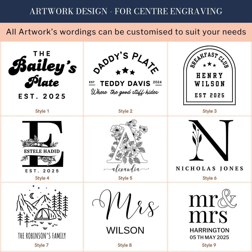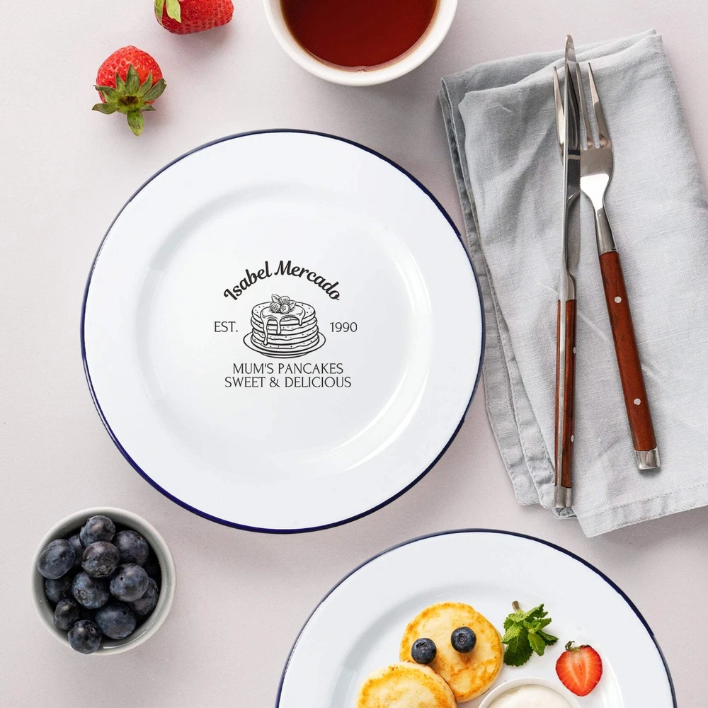 Custom Engraved Enamel Camping Retro Plate Custom Engraved Enamel Camping Retro Plate DETAILS ★ Discover the Perfect Enamel Plates: Ideal for both indoor and outdoor dining: Enjoy your favourite meals with our distinctive Enamel Plates. Whether it's a personalised plate that brings a traditional style to your table or an adventurer's enamel plate perfect for camping and picnics, these plates are a must-have. They make a wonderful gift for the adventurer in the family or any friend who loves the outdoors! Perfect for hiking trips, camping weekends, lazy beach days, and picnics, these plates add a unique touch to your table setting. ★ Retro Charm and Timeless Design - Our Enamel Plates feature a classic blue and white finish reminiscent of American diners, adding a nostalgic touch that guests will love. - The retro blue and white enamel design not only enhances the aesthetic appeal but also makes a statement on any table. The blue rim creates a unique look and makes it easy for people to identify the edge of the plate, ideal for care homes or those with vision difficulties. ★ Perfect for Any Dessert & Food: Ideal for both indoor and outdoor dining, these plates available in two sizes, 24.5 cm and 30 cm, provide a stylish means of serving cold meats, steak, sandwiches, BBQ, cheese, pasta, puddings, desserts, homemade cakes, , pancakes, waffles, sweet treats, breakfast, and more. ★ Timeless Design: The retro blue and white enamel design not only enhances aesthetic appeal but also makes a statement on any table, elevating the presentation of your food. The blue rim creates a unique look and makes it easy for people to identify the edge of the plate, ideal for care homes or those with vision difficulties. ★ Durable and Long-Lasting: Crafted from heavy-duty stainless steel and covered with an ultra-durable, fuséd-glass coating, these plates develop a unique character over time. The enamel coating is heat and chemical resistant, making these plates highly versatile. They are safe for use in the oven and microwave for reheating food and can be easily cleaned in the dishwasher. The stainless-steel interior ensures long-lasting durability, even in customer-facing environments. ★ Exceptional Versatility: The enamel coating on these plates is both heat and chemical resistant, allowing you to serve homemade ice cream directly from the freezer or bake a delicious apple crumble in the oven. These bowls can handle it all. ★ Personalisation Options: Personalise your Enamel Kitchenware with initials, a name, or a custom logo to create a unique, personalised piece that reflects your style and identity. They make exceptional gifts for kids, Father’s Day, Mother’s Day, teachers, wedding favours, birthdays, housewarmings, couples, and any occasion where a thoughtful touch is appreciated. Choose from a wide range of designs to find the perfect match. ★ Ideal for Various Settings: Designed to withstand the rigours of everyday use, cleaning, and storage, our Enamel Tableware are equally at home in commercial settings like restaurants, cafes, and hotels. Their durability ensures they maintain a fresh appearance even with frequent use. It can be safely uséd it in the oven and microwave when reheating drinks. ★ Corporate Gifting and Promotions: Enhance your business relationships by personalising Enamel Plates with client names, monograms, or company logos. They make memorable closing gifts or promotional items that leave a lasting impression. ★ Stylish: Choose from a wide range of design options to personalise your plate, ensuring it reflects your unique style. ★ Safe: BPA-free and crafted with quality materials, our enamel tableware are designed with your safety and satisfaction in mind. ★ Care Instructions: - Our enamel tableware can be washed in the dishwasher, ensuring quick and convenient cleaning. The classic retro blue and white enamel tableware gains a unique character with repeated use, as chips and imperfections contribute to its individual charm. - To maintain a flawless appearance, avoid using the dishwasher. Clean gently with non-abrasive cleaners and avoid scourers to preserve the enamel finish. SPECIFICATIONS Dimensions : Available in 2 Sizes: - Medium: H x D: 25 x 245 mm ( 0.98" x 9.65" ) - Large: H x D: 25 x 300 mm ( 0.98" x 11.81" ) Material: Enamel Steel, Fuséd Glass Coating Technique: Laser Engraved. Personalise any design with names, dates, templates, logos, or images. Our high-quality, long-lasting laser engraving surpasses vinyl stickers, ensuring durability and a professional finish. Note: Chips and imperfections are part of products' individual look. HOW TO ORDER 1. Choose your preferred size: Select whether you want Medium or Large size 2. Choose your Engraving Side: Select whether you want engraving on the top or bottom rim, the centre of the plate, or both. 3. Type in Engraving Style and Order: Specify the engraving style and the exact text you want engraved based on our provided Design Template Options. You can add any additional instructions in brackets (). Please refer to Style #A - Style #R for the Plate Rim's Engraving Example: - Top Rim: Style #O: Timothy Harrington - Bottom Rim: Style #O: Amelia Harrington - Centre: Style #9: mr&mrs Harrington, 05th May 2025 ▸If you want to use your own logo, please attach/ send us your file once you finish . Please note to attach the highest resolution file as possible to avoid quality issues Not all files are scanned prior to manufacturing, if you're not sure, please send us an email after placing the order to confirm if the file is of an acceptable quality. ▸You can combine or pick any font, icon, style, etc between our provided designs, or choose not to include a date, title or icon for example. All artwork based on our available design is free of charge. ▸If you don't like any of our template and want to create your own bespoke artwork design, please feel free to contact us with any questions you may have,