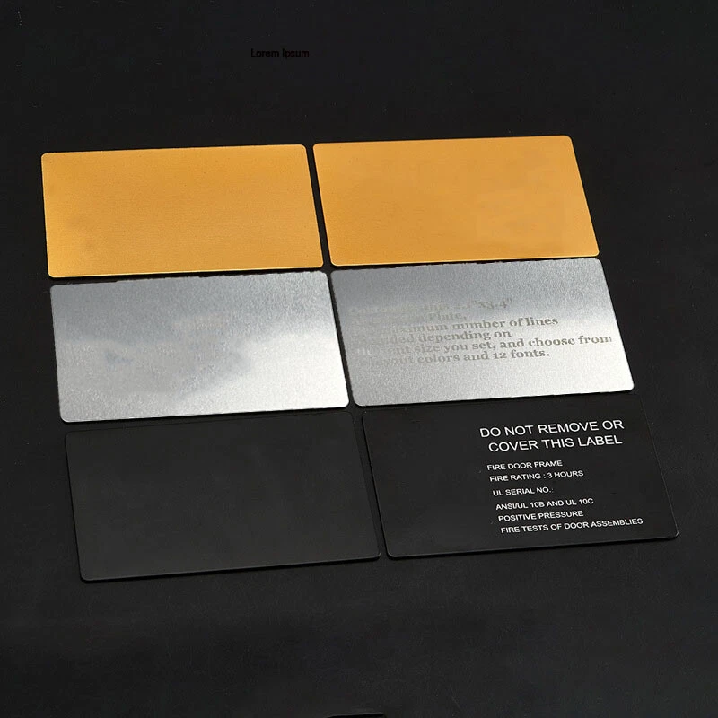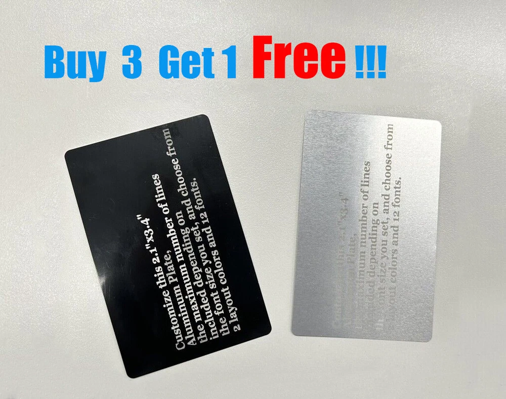 Descriptio ns : Our plates are great for personalizing any project. Perfect for all of your personalization needs such as: Flag Case, Awards, Taxidermy, Trophy, Memorial, Pet Memorial, Boy Scouts, Cub Scouts, Arrow of Light, Fantasy Football, School Projects, Church, Club, Identification tags, Employee, Recognition Plaques, etc Plate Specifica tio ns : 1. Color random delivery, if you especially like the color, you can leave a note in the order! 2. Both sides can be marked 3. Plate color: B lack & Silver & Gold 4. Material: aluminum 5. Plate Size: 8.6x5.4cm / 2.1x3.4in 6. The maximum number of lines included depending on the font size you set, and choose from 2 layout colors and 12 fonts. Order Proces s : After the purchase please send your desired engraving Text or sample design (Text and Fonts) We can also engrave logos or club badges, but this must be clarified with us before the purchase. Simply write to us via " Contact seller ". Promotio n s : Buy 3 Get 1 Free, you'll receive a total of 4. Buy 5 Get 2 Free, you'll receive a total of 7.