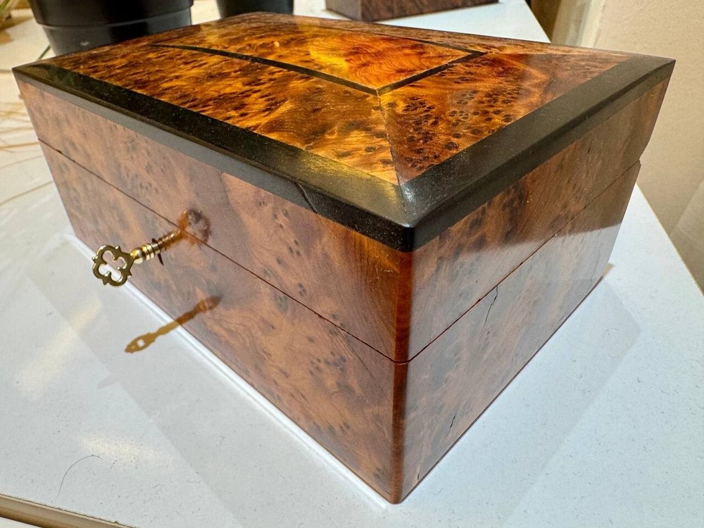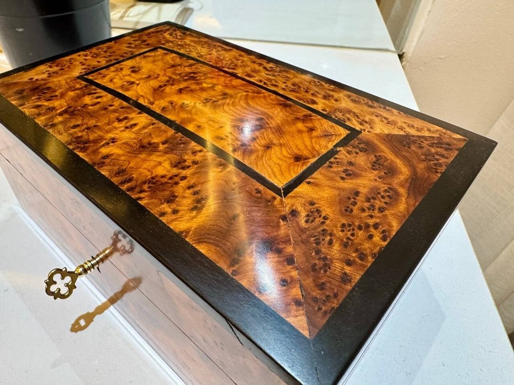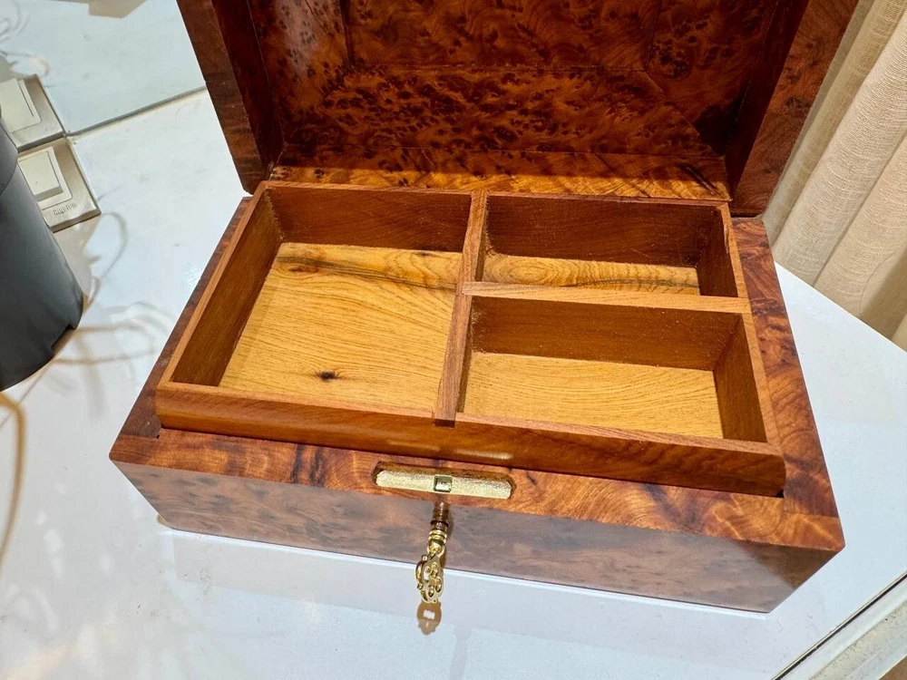 AtlasMuse Handmade Thuya Wooden Box β Crafted with Love by Moroccan Artisans AtlasMuse proudly presents its exquisite Thuya wooden box, meticulously handcrafted by skilled Moroccan artisans. Ideal for storing jewelry, cherished belongings, and important documents, this box combines functionality with timeless elegance. π‘ Quality Assured: Each box is crafted using the finest Thuya root burl wood, with careful moisture management to prevent deformation over time. β¨ Key Features: Three separated compartments inside, with spacious storage underneath (Two Storage Levels). Secure lockable design with a brass key. Customization available: engrave/print text on the lid, leather, or velvet interior lining. π Dimensions: Length: 20 cm / 7.9 inches Width: 13.5 cm / 5.3 inches Height: 8 cm / 3.1 inches π Shipping Details: Your order will be shipped within 1 day of purchase, with express shipping delivering in 3-5 business days. Experience the elegance and craftsmanship of AtlasMuse !