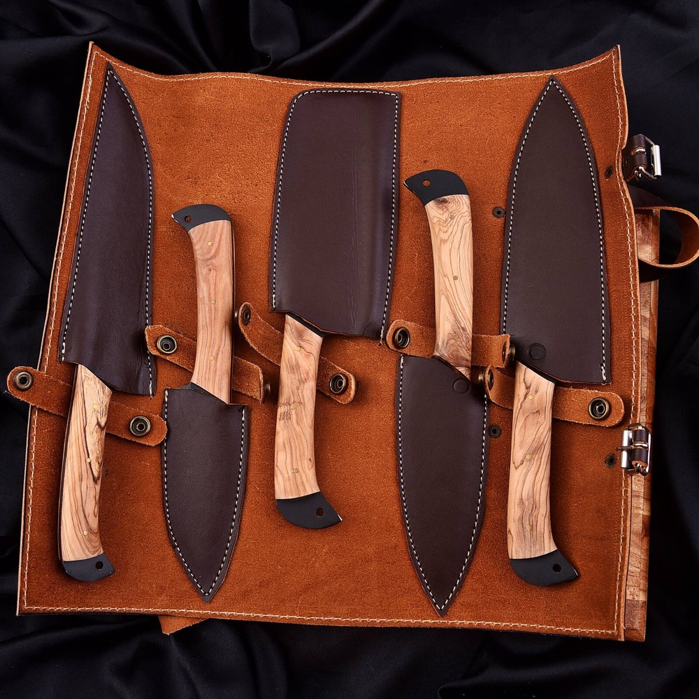 CUSTOM HAND MADE CARBON STEEL HAND FORGED BLADE CHEF KNIFE KITCHEN KNIVES SET Wood Handle This superb design knifes is hand made. Blade of this knife has a nice file work and is made of high carbon steel and hardness 55-58 H R C . This robust knife is lab tested under intense conditions, the balance and shape of this knife ensures perfect grip. Overall Pieces : 5 Cleaver Knife : Blade 6" Inches - Handle 4.75" Inches Fillet Knife : Blade 7.25" Inches - Handle 4.75" Inches Chef Knife : Blade 6.5" Inches - Handle 4.75" Inches Paring Knife : Blade 3.5" Inches - Handle 4.5" Inches Steak Knife : Blade 4.5" Inches - Handle 4.5" Inches Warning: Keep fingers clear of blades. Store away from children.