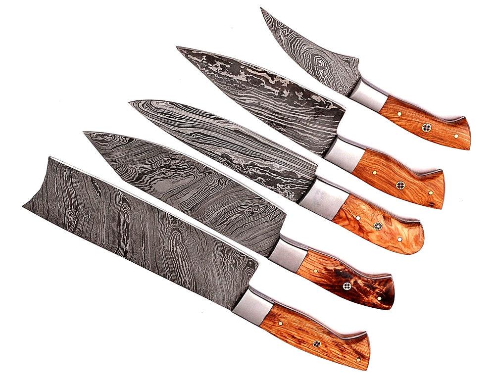 Food Compatibility: Fruit, Vegetables, Meat, Deep Fry, Salad, Universal Personalize: No Material: Damascus steel Features: With Handles Handle Material: WOOD & STEEL BOLSTER HANDLE Blade Length: 8" INCHES MPN: N/A Type: Chef's Knife Set Includes: Chef's Knife, Bread Knife, Cleaver, Boning Knife, Butcher Knife, Carving & Slicing Knives, Fillet & Larding Knives, Knife Set, Paring & Peeling Knives, Santoku Knife, Slicer, Steak Knife, Utility Knife, Vegetable Knife Blade Edge: Straight Brand: Damascus Color: Brown Number of Items in Set: 5