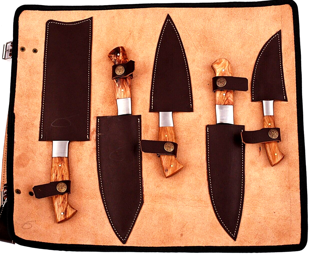 CUSTOM HAND MADE CHEF KNIFE SET FORGED DAMASCUS STEEL Wood & Steel Bolster Handle This superb design knifes is hand forged. Blade of this knife has a nice file work and is made of 512 layers of 4340 stainless steel and 1075 high carbon steel and hardness 55-58 H R C . This robust knife is lab tested under intense conditions,the balance and shape of this knife ensures perfect grip. Overall pc : 5 Cleaver Knife : Blade 7" Inches - Handle 5" Inches Santoku Knife : Blade 6.5" Inches - Handle 4.75" Inches Chef Knife : Blade 5.5" Inches - Handle 4.75" Inches Steak Knife : Blade 4.5" Inches - Handle 4.5" Inches Peel Knife : Blade 3.5" Inches - Handle 4" Inches Damascus Design: Twist Pattern Layers:512 Package Includes: with Leather Sheath Warning: Keep fingers clear of blades. Store away from children.