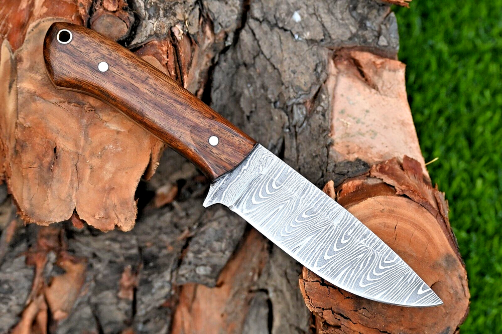 FORGED DAMASCUS STEEL SKINNER KNIFE CUSTOM MADE HAND HUNTING CAMPING SURVIVAL HIKING KNIFE Wood Handle This superb design knife is hand forged. Blade of this knife has a nice file work and is made of 512 layers of 4340 stainless steel and 1075 high carbon steel and hardness 55-58 HRC . This robust knife is lab tested under intense conditions, the balance and shape of this knife ensures perfect grip. Overall Length: 8" Inches Blade Length: 4" Inches Handle Length: 4" Inches Damascus Design: Rain Drop Pattern Layers: 512 Hardness: 55-58 HRC Package Includes: with Leather Sheath Warning: Keep fingers clear of blades. Store away from children.
