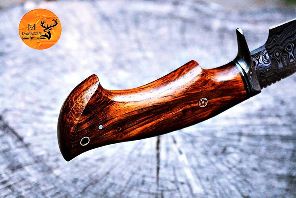 CUSTOM HAND MADE HAND FORGED DAMASCUS STEEL ENGRAVED BLADE HUNTING CAPMING TRACKER KNIFE Wood & Damascus Steel Guard Handle This superb design knife is hand forged. Blade of this knife has a nice file work and is made of 512 layers of 4340 stainless steel and 1075 high carbon steel and hardness 55-58 HRC . This robust knife is lab tested under intense conditions, the balance and shape of this knife ensures perfect grip. Overall Length: 10.5" Inches Blade Length: 5" Inches Handle Length: 5.5" Inches Damascus Design: Ladder Pattern Layers: 512 Package Includes: with Leather Sheath Warning: Keep fingers clear of blades. Store away from children.