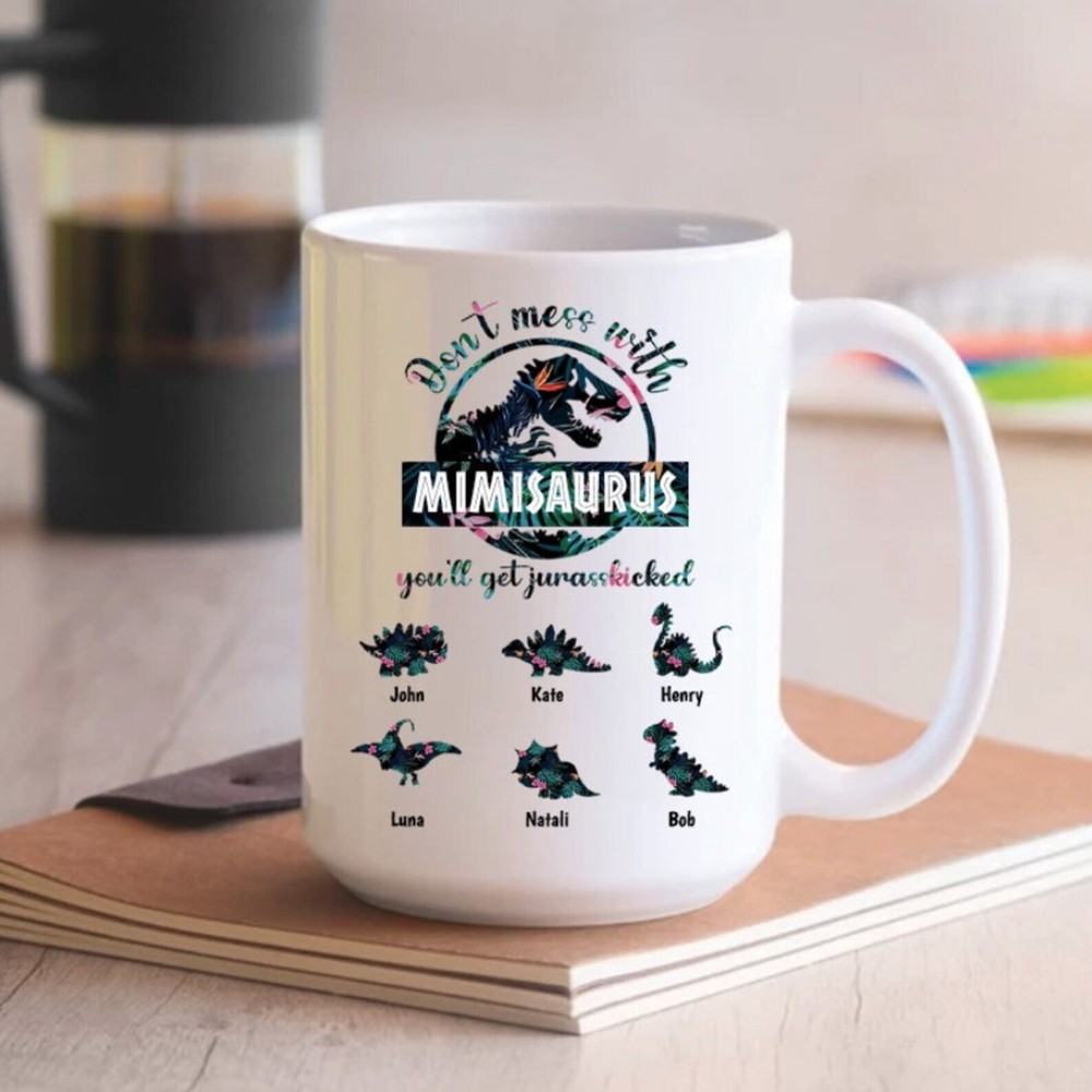 Personalized Grandma Mimisaurus Mug Gift For Grandma Granny Mimi Custom T Rex Baby Dinosaur Mothers Day Gift Birthday Nana Decor Gift Product Details.. This high quality 11oz. ceramic white mug has a premium hard coat that provides crisp and vibrant color reproduction sure to last for years. Perfect for all hot & cold beverages. The highest quality printing possible is used. It will never fade no matter how many times you wash it. Material: 100% Ceramic. Print both sides. Dishwasher and Microwave Safe. High Gloss + Premium White Finish. Printed in the U.S.A. Personalized & Custom. We support personalized and custom mug to add custom, when placing an order, you can add notes to the "order note" in shipping address section. Also you can contact us directly via message. Shipping Info. Ready to ship in 1 to 2 business days, All products are made-to-order and proudly printed in the United States. Shipped by USPS and DHL, You will receive your order in 5-7 days. Replace & Refund. All products are defective during shipping broken, chipped will be replaced free of charge. You are not satisfied with the product, we will refund 100% money to you. If any other issues arise, please do not hesitate to message, we would be more than happy to assist you.