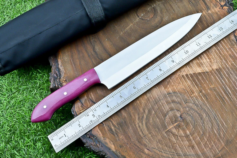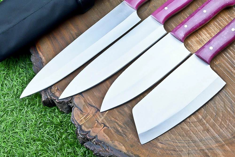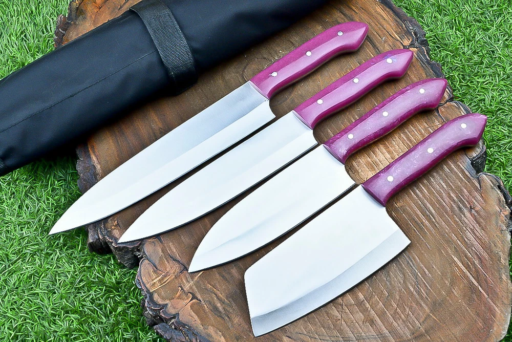 EXCLUSIVE HANDCRAFTED D2 STEEL CHEF KNFIE SET, CHEF KNIVES, KITCHEN KNIVES SET, 4 PCS SET, CAMPING KNIFE, CAMPING KNIFE EDC, Product Details: Overall Knives Length: Approximately 13", 11", 10", 9" inches Blade Length: 8", 7", 6", 5" Blade Material: Genuine D2 Steel Blade Hardness: 54-58 HRC Size Verification: To help you easily determine the size, we've included images with a scale for precise dimension reference. Thank you for your understanding. We appreciate your consideration. Included Accessories: High-quality synthetic fabric (nylon) roll bag with reinforced stitching for durability Handle Material: Resin scales fastened with brass pins. For International Customers: We kindly advise our international customers to familiarize themselves with their country's regulations prior to making a purchase. If customs in your region request customs duties, please be prepared to cover these costs. Regrettably, we cannot assume responsibility, nor issue refunds in such cases. AGE LIMITATION: Please note that we exclusively sell knives to individuals who are 18 years of age or older. Additional Details: Leather Sheath (if pictured): Rest assured, this item comes with a superior-quality, sheath. Crafted with meticulous hand-tooling and stitching, it exemplifies fine craftsmanship and is designed for exceptional durability. The added stitching ensures it withstands years of demanding use, providing reliable protection for your knife throughout its lifetime. Care and Maintenance: When necessary, use a Diamond Wet Stone or a superior sharpening tool to maintain a 20-degree blade edge. After use, clean the item with soap and water, ensure thorough drying, coat it with gun oil, and store it separately from the sheath. Leather absorbs moisture from the air and can lead to blade rust if stored improperly. Customer Feedback: Your satisfaction and feedback are of utmost importance to us. We genuinely appreciate your positive reviews! When assessing shipping time, please consider international transit. Your recognition bolsters our confidence to enhance our services. If you encounter any issues with your order or product dissatisfaction, please reach out to us first. We are committed to resolving any concerns to your satisfaction and kindly request you not to leave neutral or negative feedback. Payments & Returns: All accepted eBay payment methods are available for this purchase. Our return policy typically extends to 14 days. Shipping and Handling: We offer free shipping on all our products (In the USA) Tracking Info: The buyer will receive the tracking number via email (if available). You can also track the shipment in the "Order Details" section on eBay. USPS UPS DHL updates tracking information nightly (if available). Contact: Feel free to contact us anytime via eBay messages. We are dedicated to responding to your inquiries within 24 hours and providing the best possible assistance.