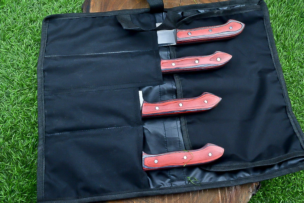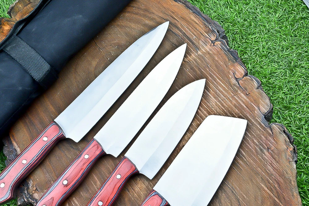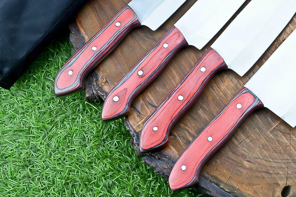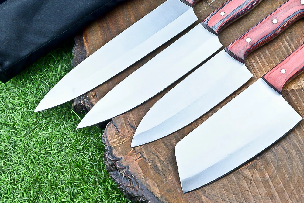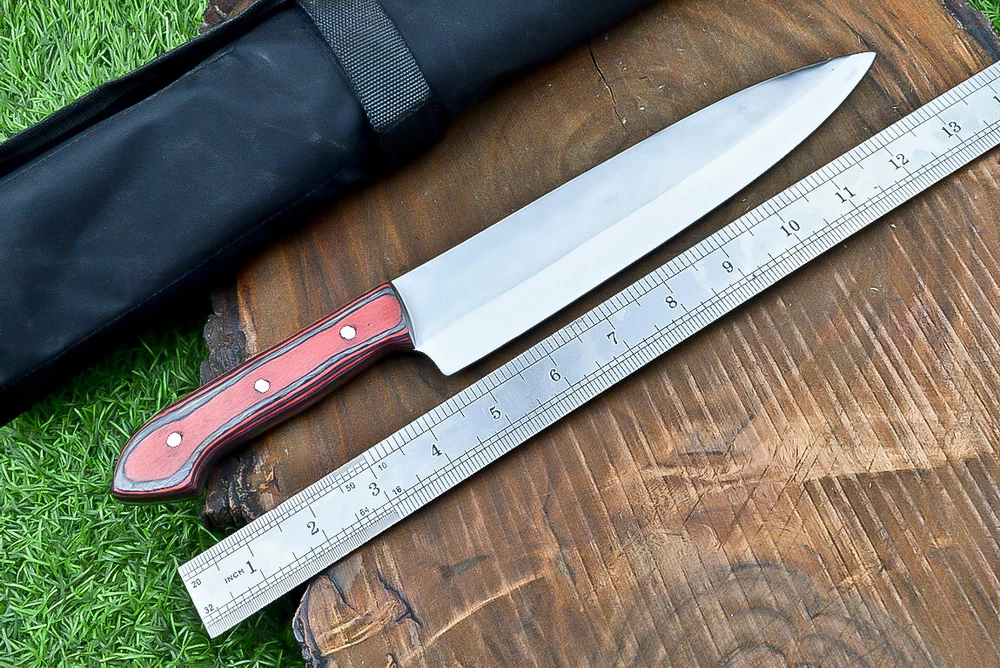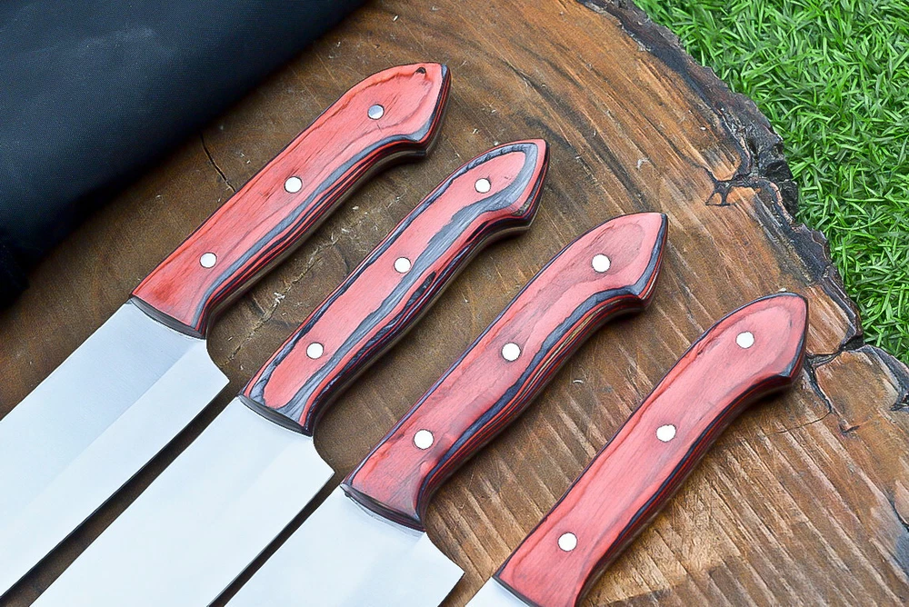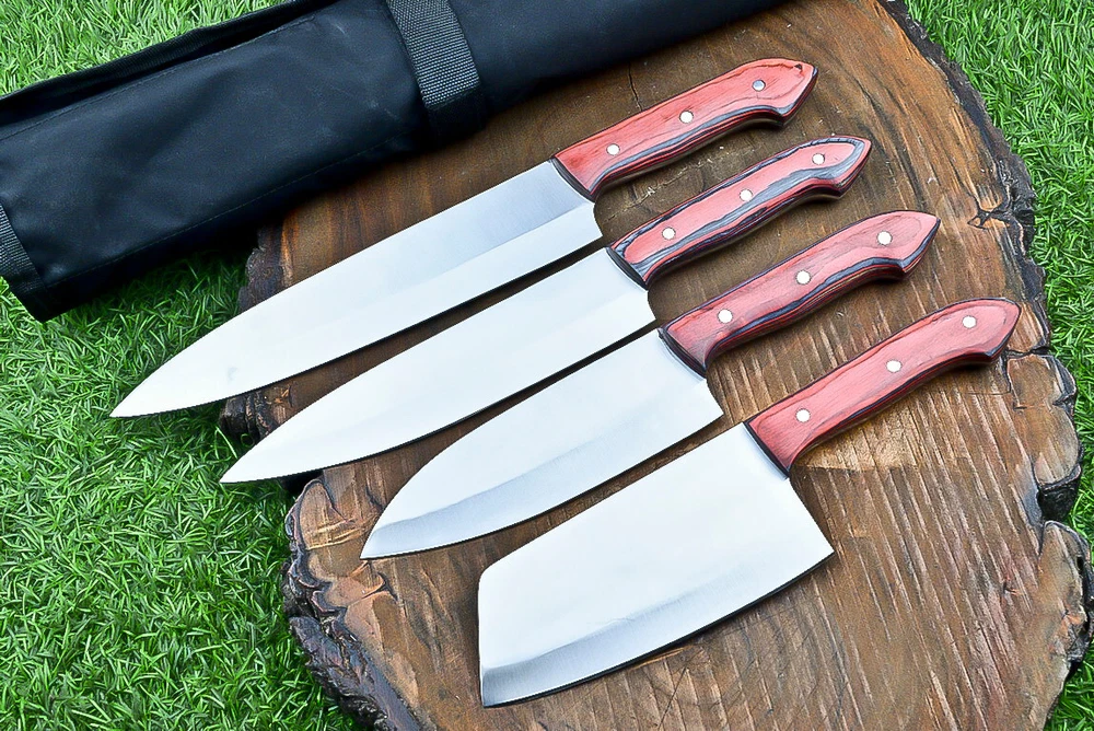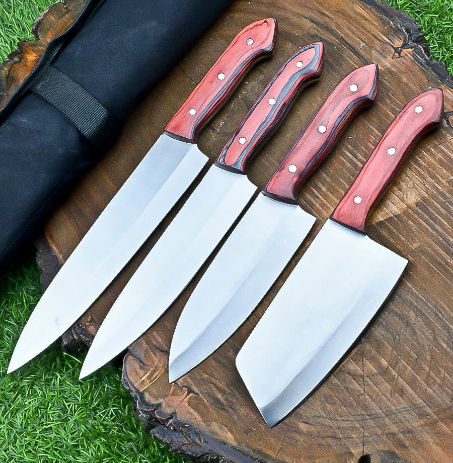 EXCLUSIVE HANDCRAFTED D2 STEEL CHEF KNFIE SET, CHEF KNIVES, KITCHEN KNIVES SET, 4 PCS SET, CAMPING KNIFE, CAMPING KNIFE EDC, Product Details: Overall Knives Length: Approximately 13", 11", 10", 9" inches Blade Length: 8", 7", 6", 5" Blade Material: Genuine D2 Steel Blade Hardness: 54-58 HRC Size Verification: To help you easily determine the size, we've included images with a scale for precise dimension reference. Thank you for your understanding. We appreciate your consideration. Included Accessories: High-quality synthetic fabric (nylon) roll bag with reinforced stitching for durability Handle Material: Wood scales fastened with brass pins. For International Customers: We kindly advise our international customers to familiarize themselves with their country's regulations prior to making a purchase. If customs in your region request customs duties, please be prepared to cover these costs. Regrettably, we cannot assume responsibility, nor issue refunds in such cases. AGE LIMITATION: Please note that we exclusively sell knives to individuals who are 18 years of age or older. Additional Details: Leather Sheath (if pictured): Rest assured, this item comes with a superior-quality, sheath. Crafted with meticulous hand-tooling and stitching, it exemplifies fine craftsmanship and is designed for exceptional durability. The added stitching ensures it withstands years of demanding use, providing reliable protection for your knife throughout its lifetime. Care and Maintenance: When necessary, use a Diamond Wet Stone or a superior sharpening tool to maintain a 20-degree blade edge. After use, clean the item with soap and water, ensure thorough drying, coat it with gun oil, and store it separately from the sheath. Leather absorbs moisture from the air and can lead to blade rust if stored improperly. Customer Feedback: Your satisfaction and feedback are of utmost importance to us. We genuinely appreciate your positive reviews! When assessing shipping time, please consider international transit. Your recognition bolsters our confidence to enhance our services. If you encounter any issues with your order or product dissatisfaction, please reach out to us first. We are committed to resolving any concerns to your satisfaction and kindly request you not to leave neutral or negative feedback. Payments & Returns: All accepted eBay payment methods are available for this purchase. Our return policy typically extends to 14 days. Shipping and Handling: We offer free shipping on all our products (In the USA) Tracking Info: The buyer will receive the tracking number via email (if available). You can also track the shipment in the "Order Details" section on eBay. USPS UPS DHL updates tracking information nightly (if available). Contact: Feel free to contact us anytime via eBay messages. We are dedicated to responding to your inquiries within 24 hours and providing the best possible assistance.