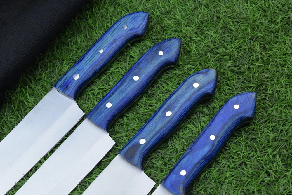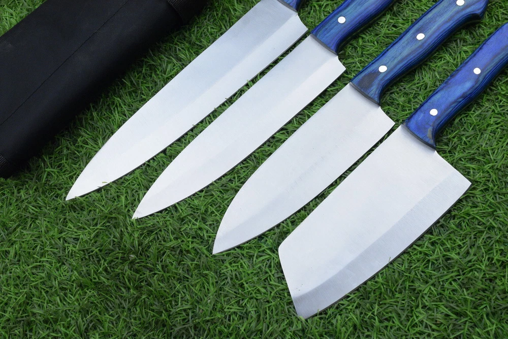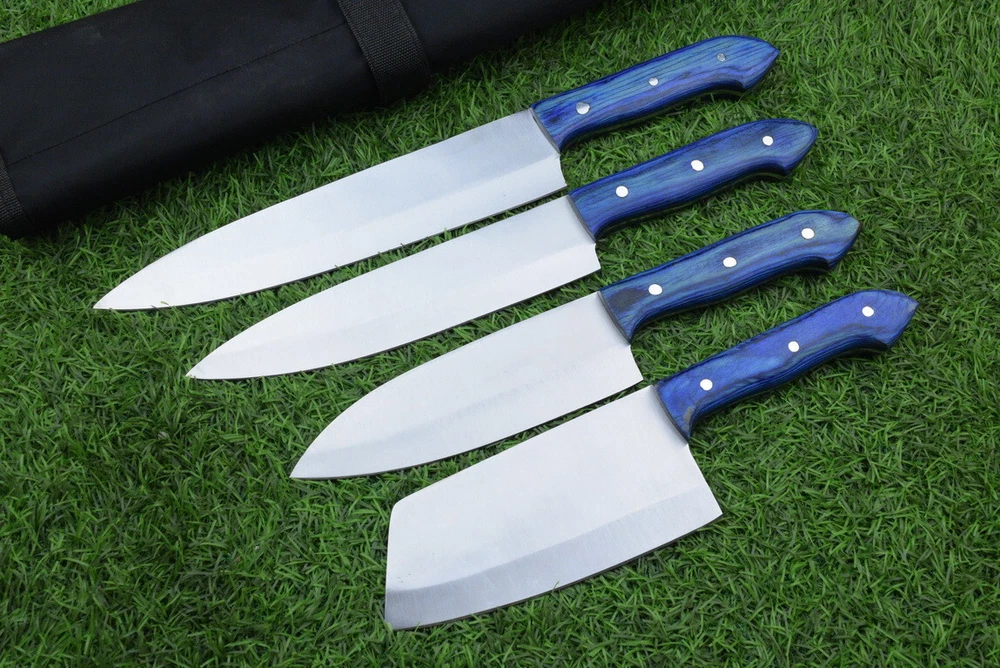 EXCLUSIVE HANDCRAFTED D2 STEEL CHEF KNFIE SET, CHEF KNIVES, KITCHEN KNIVES SET, 4 PCS SET, CAMPING KNIFE, CAMPING KNIFE EDC, Product Details: Overall Knives Length: Approximately 13", 11", 10", 9" inches Blade Length: 8", 7", 6", 5" Blade Material: Genuine D2 Steel Blade Hardness: 54-58 HRC Size Verification: To help you easily determine the size, we've included images with a scale for precise dimension reference. Thank you for your understanding. We appreciate your consideration. Included Accessories: High-quality synthetic fabric (nylon) roll bag with reinforced stitching for durability Handle Material: Wood scales fastened with brass pins. For International Customers: We kindly advise our international customers to familiarize themselves with their country's regulations prior to making a purchase. If customs in your region request customs duties, please be prepared to cover these costs. Regrettably, we cannot assume responsibility, nor issue refunds in such cases. AGE LIMITATION: Please note that we exclusively sell knives to individuals who are 18 years of age or older. Additional Details: Leather Sheath (if pictured): Rest assured, this item comes with a superior-quality, sheath. Crafted with meticulous hand-tooling and stitching, it exemplifies fine craftsmanship and is designed for exceptional durability. The added stitching ensures it withstands years of demanding use, providing reliable protection for your knife throughout its lifetime. Care and Maintenance: When necessary, use a Diamond Wet Stone or a superior sharpening tool to maintain a 20-degree blade edge. After use, clean the item with soap and water, ensure thorough drying, coat it with gun oil, and store it separately from the sheath. Leather absorbs moisture from the air and can lead to blade rust if stored improperly. Customer Feedback: Your satisfaction and feedback are of utmost importance to us. We genuinely appreciate your positive reviews! When assessing shipping time, please consider international transit. Your recognition bolsters our confidence to enhance our services. If you encounter any issues with your order or product dissatisfaction, please reach out to us first. We are committed to resolving any concerns to your satisfaction and kindly request you not to leave neutral or negative feedback. Payments & Returns: All accepted eBay payment methods are available for this purchase. Our return policy typically extends to 14 days. Shipping and Handling: We offer free shipping on all our products (In the USA) Tracking Info: The buyer will receive the tracking number via email (if available). You can also track the shipment in the "Order Details" section on eBay. USPS UPS DHL updates tracking information nightly (if available). Contact: Feel free to contact us anytime via eBay messages. We are dedicated to responding to your inquiries within 24 hours and providing the best possible assistance.