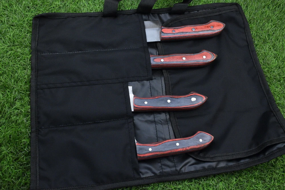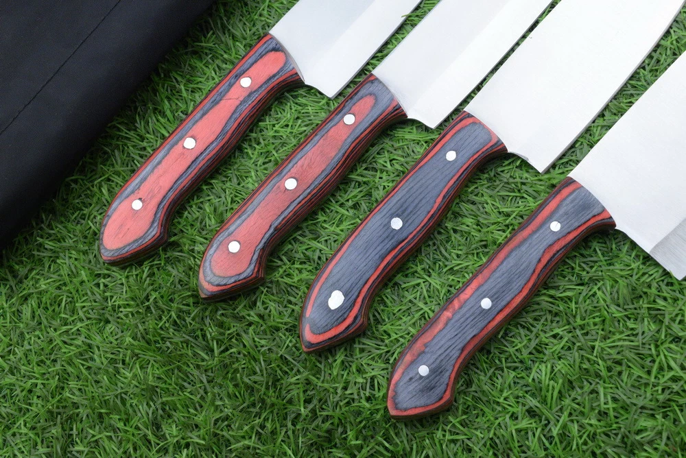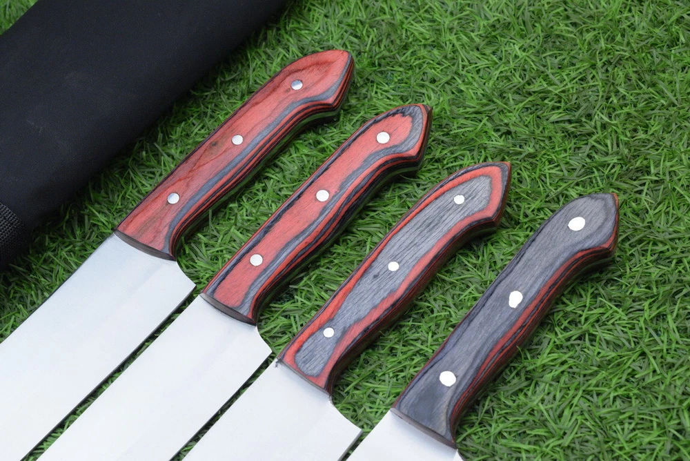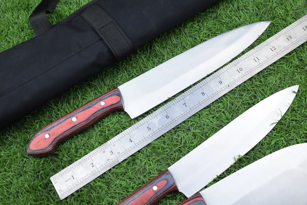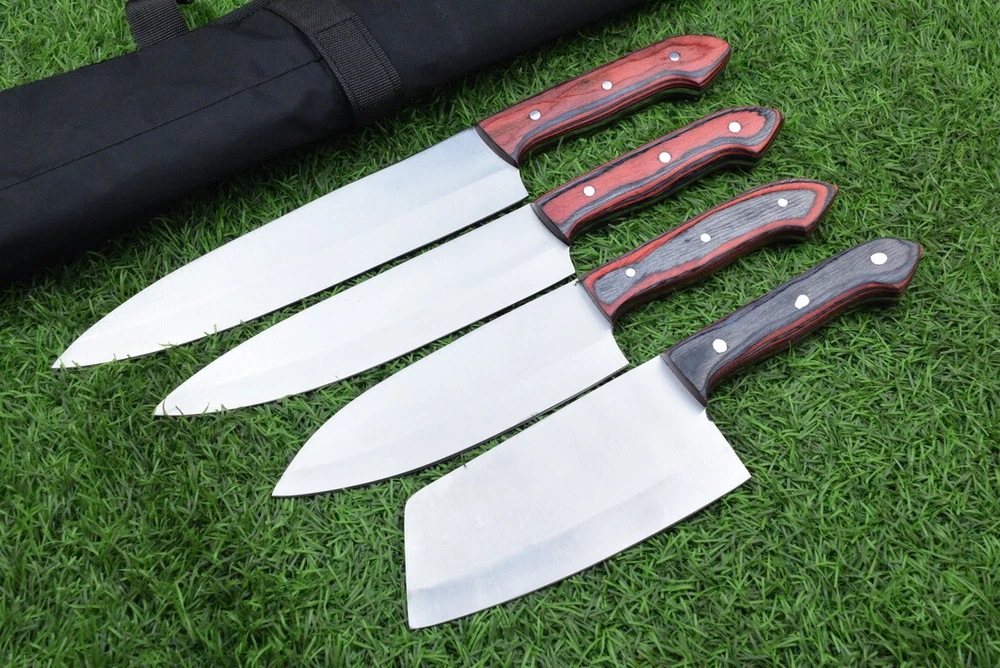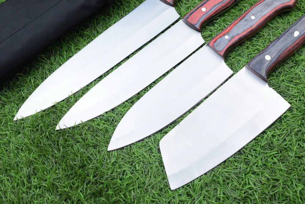 EXCLUSIVE HANDCRAFTED J2 STEEL CHEF KNFIE SET, CHEF KNIVES, KITCHEN KNIVES SET, 4 PCS SET, CAMPING KNIFE, CAMPING KNIFE EDC, Product Details: Overall Knives Length: Approximately 13", 11", 10", 9" inches Blade Length: 8", 7", 6", 5" Blade Material: Genuine J2 Steel Blade Hardness: 54-58 HRC Size Verification: To help you easily determine the size, we've included images with a scale for precise dimension reference. Thank you for your understanding. We appreciate your consideration. Included Accessories: High-quality synthetic fabric (nylon) roll bag with reinforced stitching for durability Handle Material: Wood scales fastened with brass pins. For International Customers: We kindly advise our international customers to familiarize themselves with their country's regulations prior to making a purchase. If customs in your region request customs duties, please be prepared to cover these costs. Regrettably, we cannot assume responsibility, nor issue refunds in such cases. AGE LIMITATION: Please note that we exclusively sell knives to individuals who are 18 years of age or older. Additional Details: Leather Sheath (if pictured): Rest assured, this item comes with a superior-quality, sheath. Crafted with meticulous hand-tooling and stitching, it exemplifies fine craftsmanship and is designed for exceptional durability. The added stitching ensures it withstands years of demanding use, providing reliable protection for your knife throughout its lifetime. Care and Maintenance: When necessary, use a Diamond Wet Stone or a superior sharpening tool to maintain a 20-degree blade edge. After use, clean the item with soap and water, ensure thorough drying, coat it with gun oil, and store it separately from the sheath. Leather absorbs moisture from the air and can lead to blade rust if stored improperly. Customer Feedback: Your satisfaction and feedback are of utmost importance to us. We genuinely appreciate your positive reviews! When assessing shipping time, please consider international transit. Your recognition bolsters our confidence to enhance our services. If you encounter any issues with your order or product dissatisfaction, please reach out to us first. We are committed to resolving any concerns to your satisfaction and kindly request you not to leave neutral or negative feedback. Payments & Returns: All accepted eBay payment methods are available for this purchase. Our return policy typically extends to 14 days. Shipping and Handling: We offer free shipping on all our products (In the USA) Tracking Info: The buyer will receive the tracking number via email (if available). You can also track the shipment in the "Order Details" section on eBay. USPS UPS DHL updates tracking information nightly (if available). Contact: Feel free to contact us anytime via eBay messages. We are dedicated to responding to your inquiries within 24 hours and providing the best possible assistance.