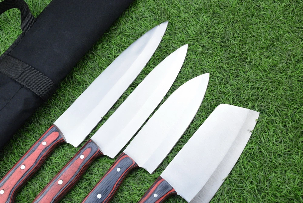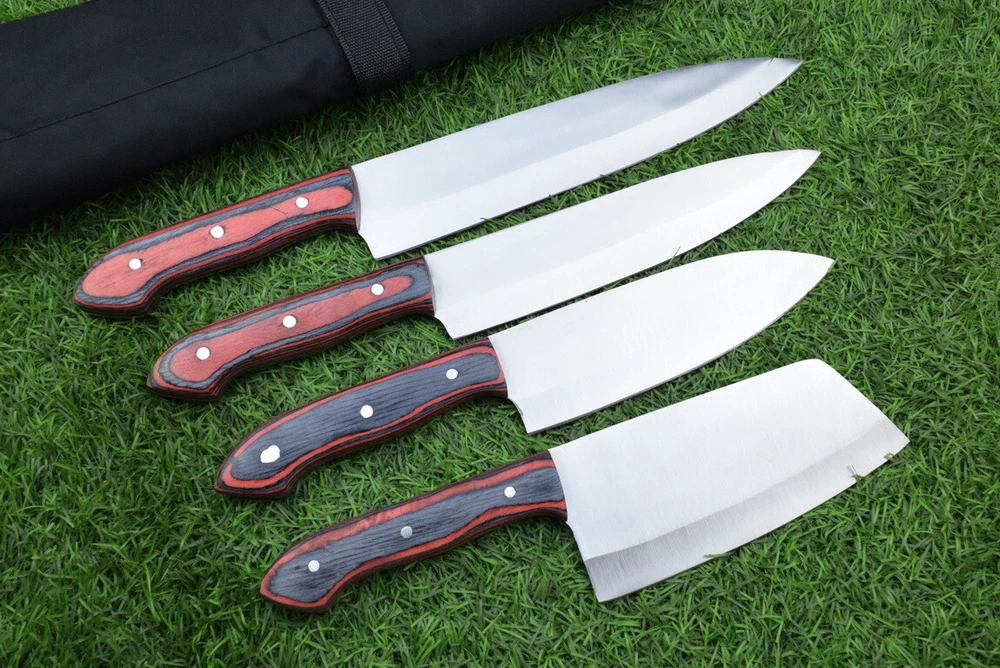 Food Compatibility: Cheese, Fruit, Meat, Salad, Universal, Vegetables Set Includes: Carving & Slicing Knives, Chef's Knife, Cleaver, Santoku Knife, Utility Knife Material: J2 STEEL Number of Items in Set: 4 Country/Region of Manufacture: United States Handle Material: wood Brand: Handmade Type: Chef's Knife Blade Edge: Straight