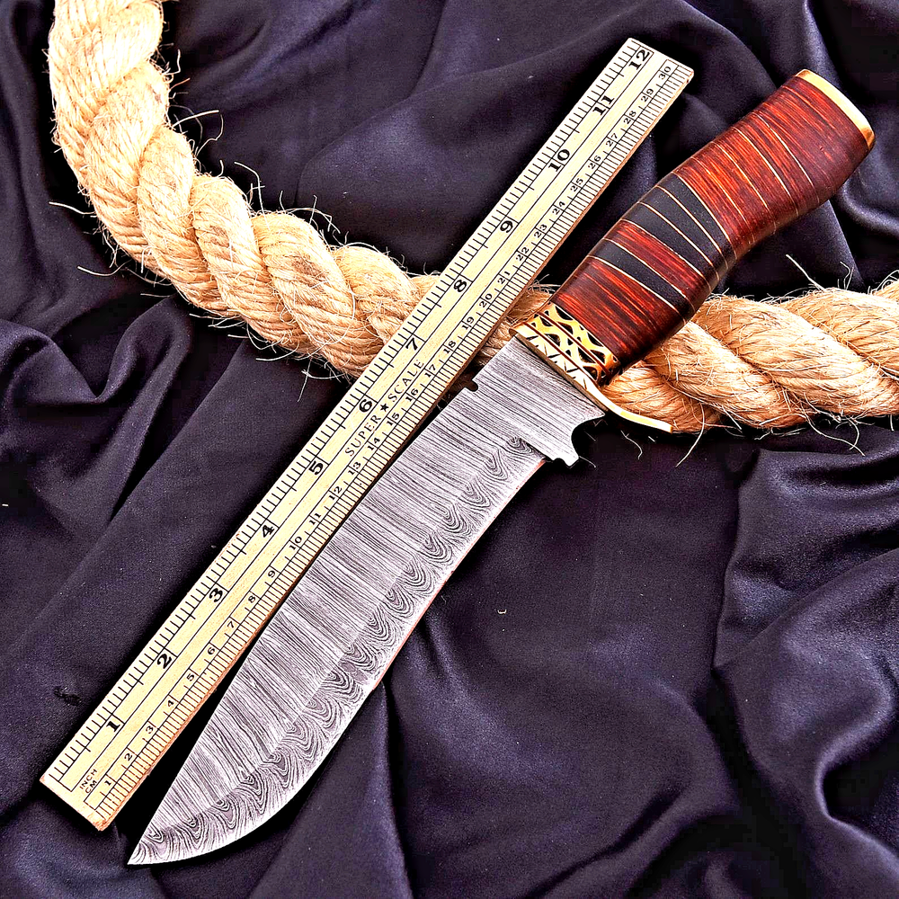 CUSTOM HAND MADE HUNTING CAMPING SURVIVAL BOWIE KNIFE HAND FORGED DAMASCUS STEEL BLADE Wood Handle This superb design knife is hand forged. Blade of this knife has a nice file work and is made of 512 layers of 4340 stainless steel and 1075 high carbon steel and hardness 55-58 HRC . This robust knife is lab tested under intense conditions, the balance and shape of this knife ensures perfect grip. Overall Length: 13" Inches Blade Length: 8" Inches Handle Length: 5" Inches Damascus Design: Twist Pattern Layers: 512 Hardness: 55-58 HRC Package Includes: with Leather Sheath Warning: Keep fingers clear of blades. Store away from children.