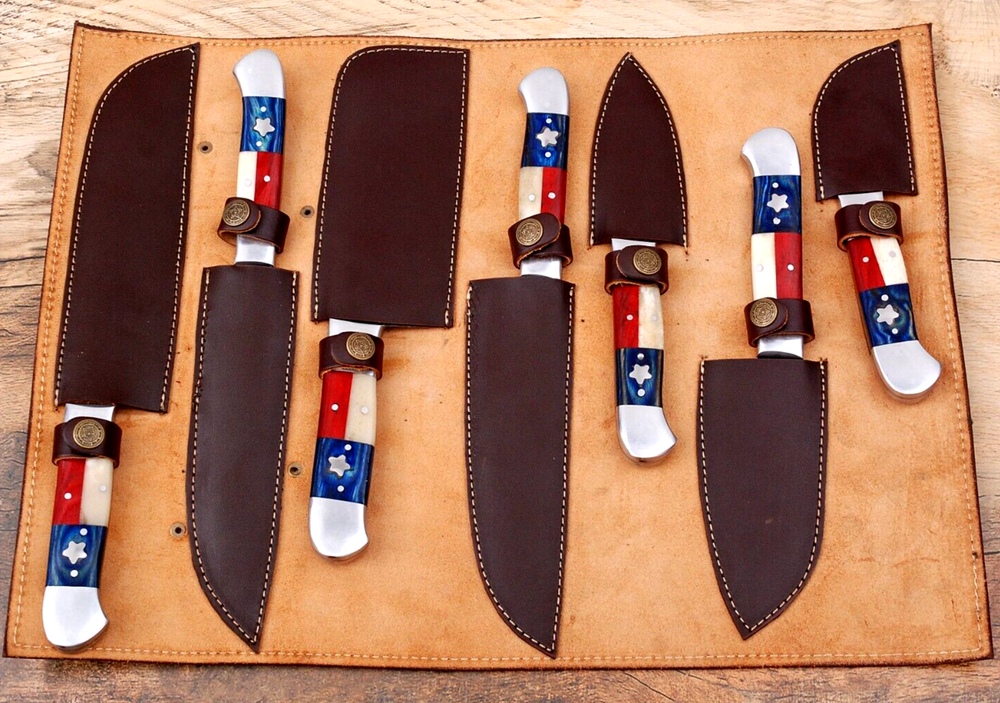 CUSTOM HANDMADE HAND FORGED DAMASCUS STEEL CHEF KNIFE SET KITCHEN KNIFE SET Camel Bone & Wood With Steel Bolster Handle This superb design knifes is hand forged. Blade of this knife has a nice file work and is made of 512 layers of 4340 stainless steel and 1075 high carbon steel and hardness 55-58 H R C . This robust knife is lab tested under intense conditions, the balance and shape of this knife ensures perfect grip. Overall Pieces : 7 Bread Knife : Blade 8" Inches - Handle 4.75" Inches Slicing Knife : Blade 7" Inches - Handle 4.75" Inches Chef Knife : Blade 5" Inches - Handle 4.75" Inches Cleaver Knife : Blade 6.25" Inches - Handle 4.75" Inches fillet Knife : Blade 6.25" Inches - Handle 4.75" Inches Santoku Knife : Blade 4.25" Inches - Handle 4.75" Inches Peel Knife : Blade 3.25" Inches - Handle 4.75" Inches Damascus Design: Twist Pattern Layers:512 Care Instructions: Keep the knife dry after each cleaning. Warning: Keep fingers clear of blades. Store away from children.